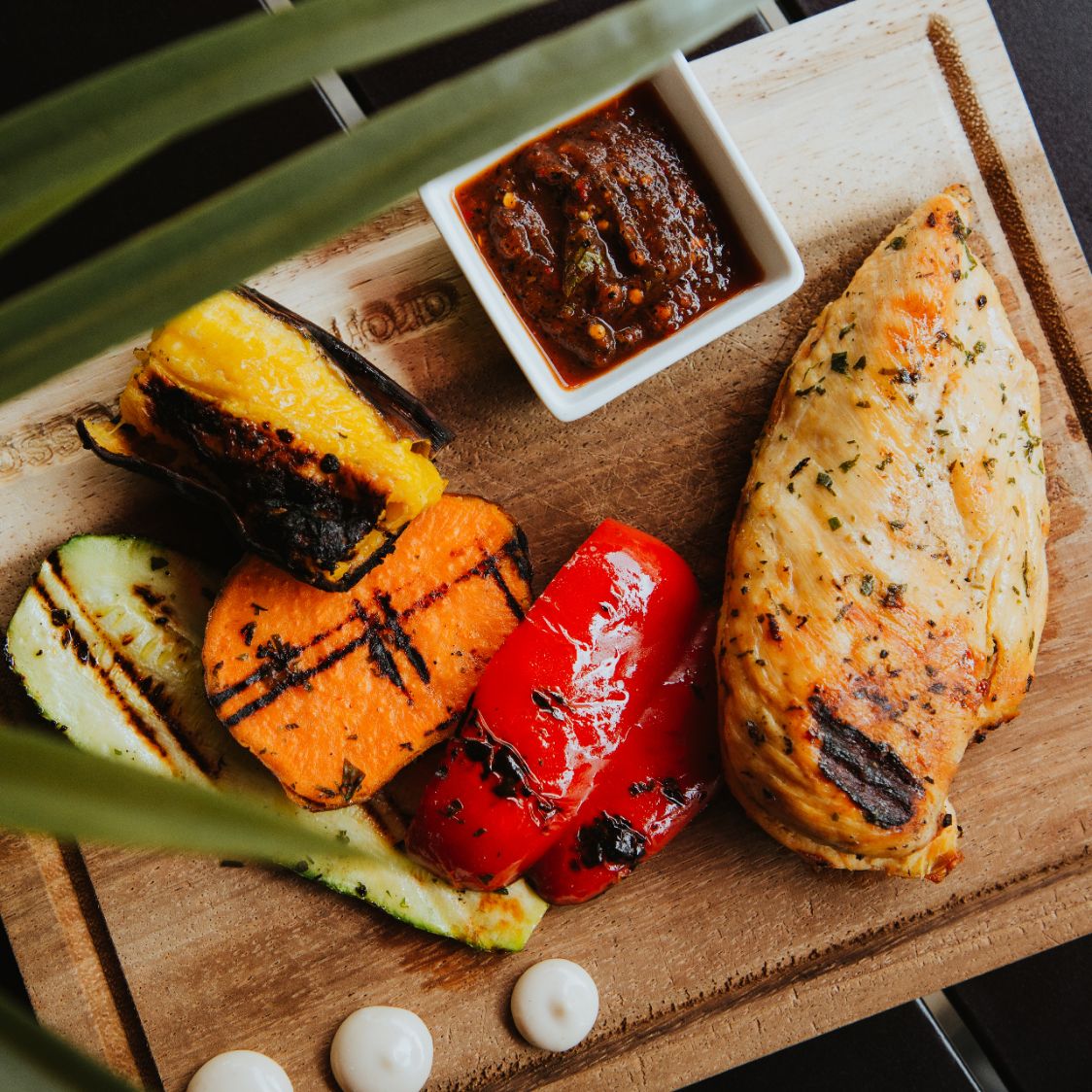 Pechuga de pollo (320 grs) a la parrilla servida con vegetales a la parrilla, alioli de comino con habanero y pan focaccia.