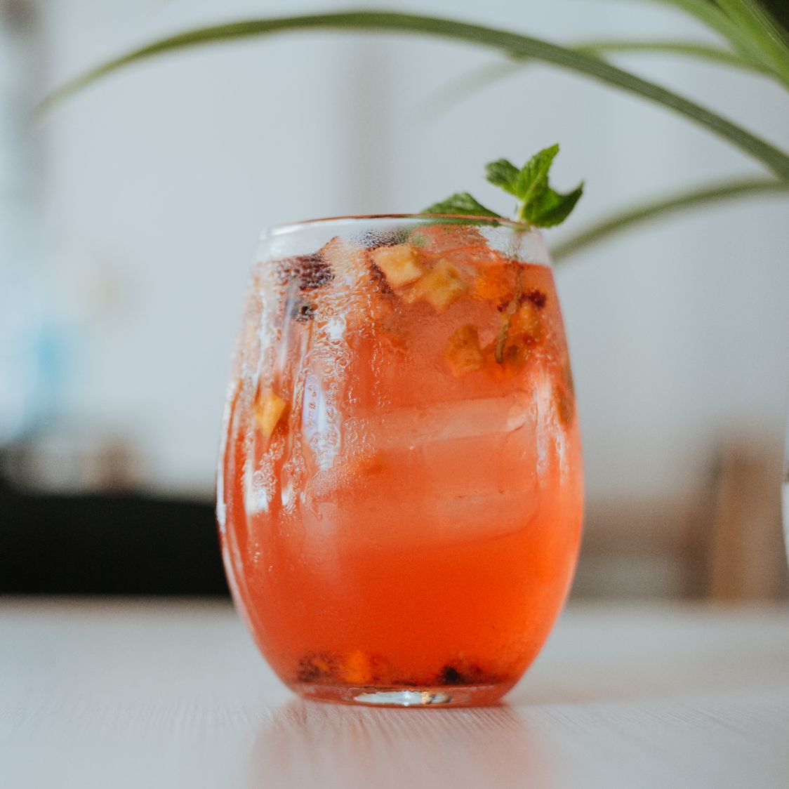 Limonada mineral elaborada con infusion de petalos de rosa, pétalos de calendula, mango, maracuyá, durazno, pimienta roja y flores de jasmín.