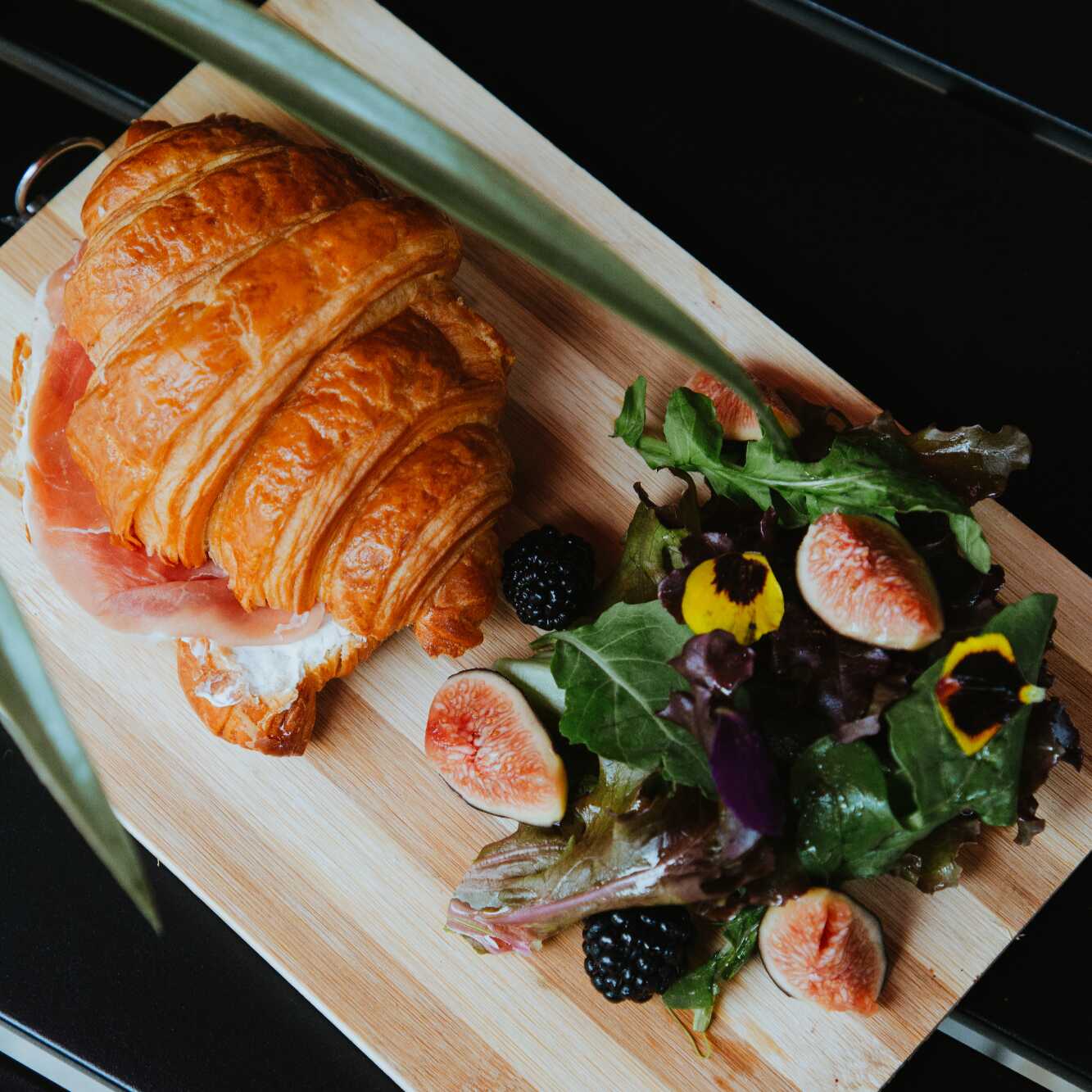 Croissant servido con queso jocoque, jamón serrano acompañado de mix de lechugas frescas, higo y zarzamora