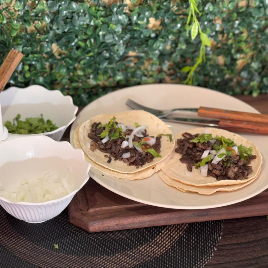 TACO DE CARNE ASADA ,COMPLEMENTOS ,SALSA,CEBOLLA,CILANTRO,TORTILLA Y LIMONES.