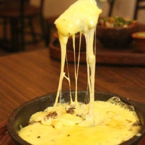 queso manchego gratinado con la carne de su eleccion, (asada, pastor, chorizo, longaniza, chistorra, chorizo argentino), acompañado de tortillas de harina.