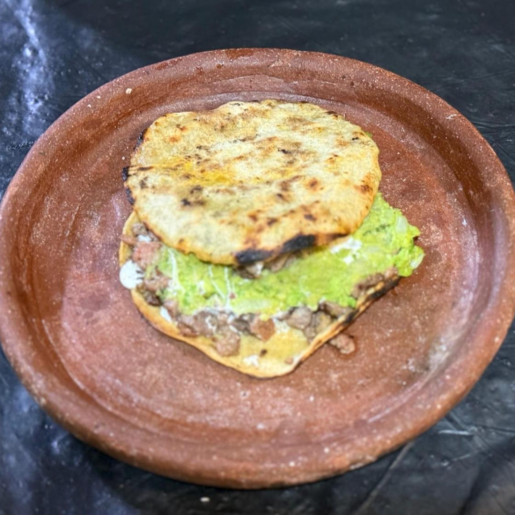 Tortilla de maiz, guacamole, queso oaxaca y carne a elegir, (asada, pastor, chorizo, longaniza, mixto).