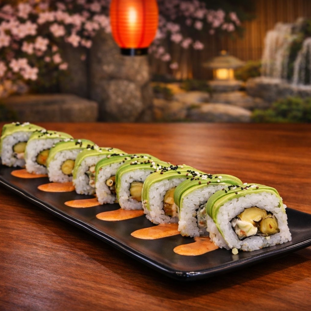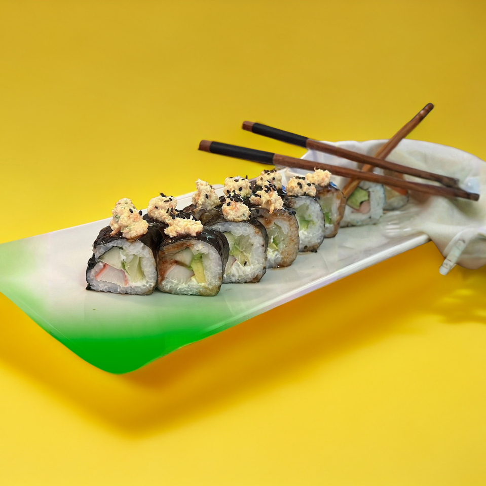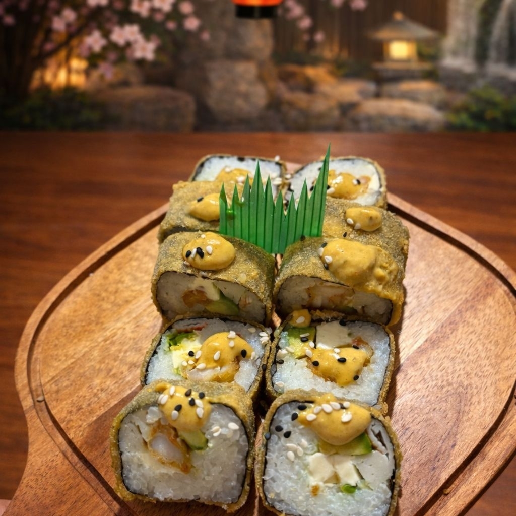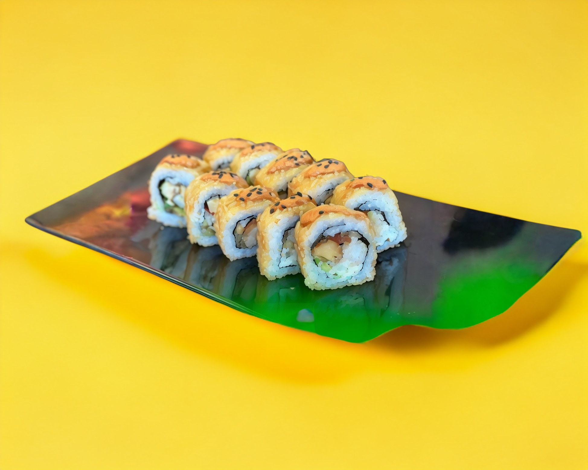10 bocados-Surimi, camarón, agaucate, queso crema Philadelphia; forrado de alga nori y aderezo de nuez.