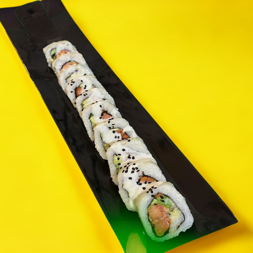 Surimi, aguacate y pepino. Por fuera: aderezo de piña y ajonjolí.