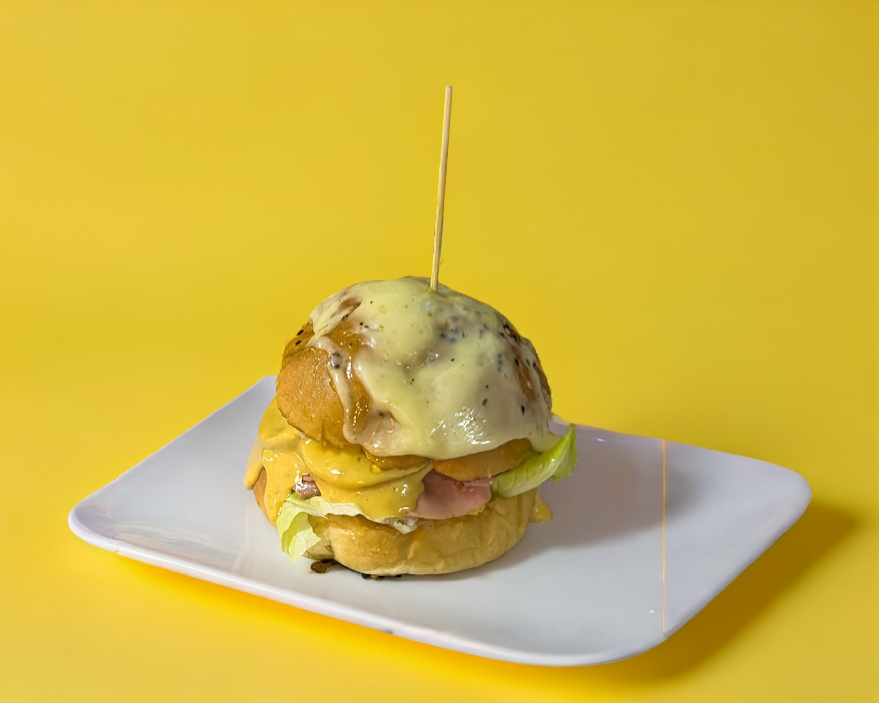 Carne de res, camaron y queso manchego. Por fuera ajonjoli y aderezo chipotle