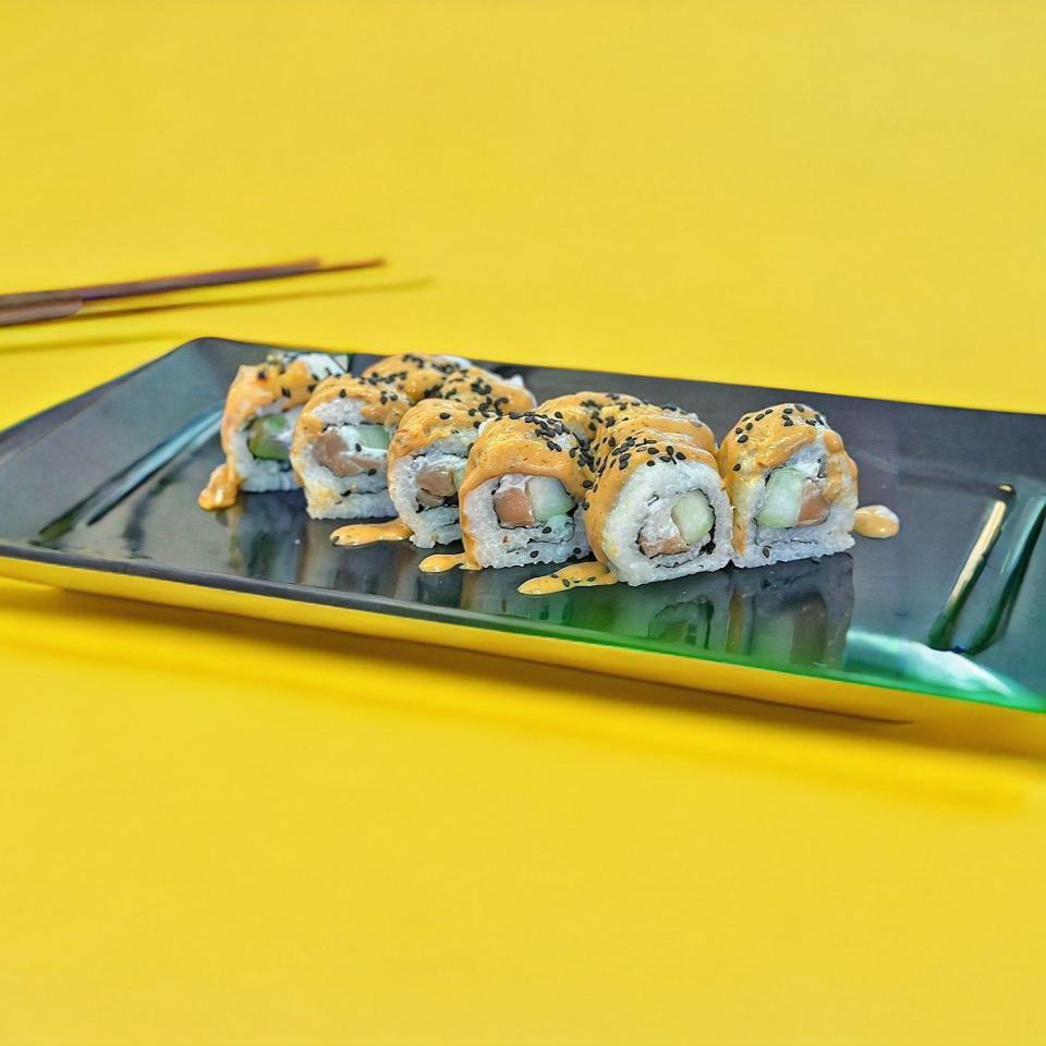 Salmon, aguacate, queso crema. Por fuera Ajonjoli y aderezo chipotle.
