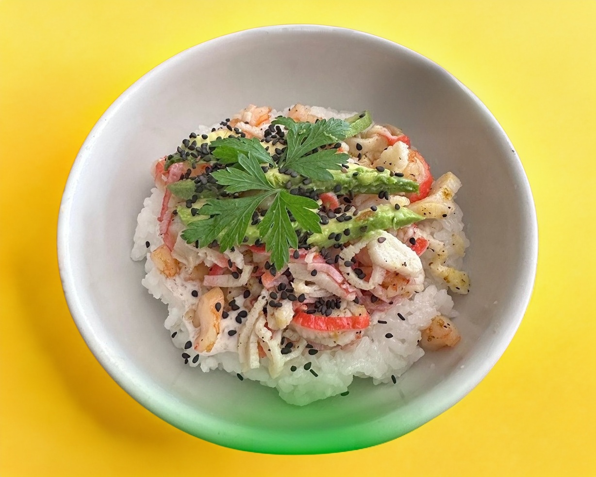 Tazón con arroz, guiso de camarón con surimi, acompañado de aguacate y crema de nuez.