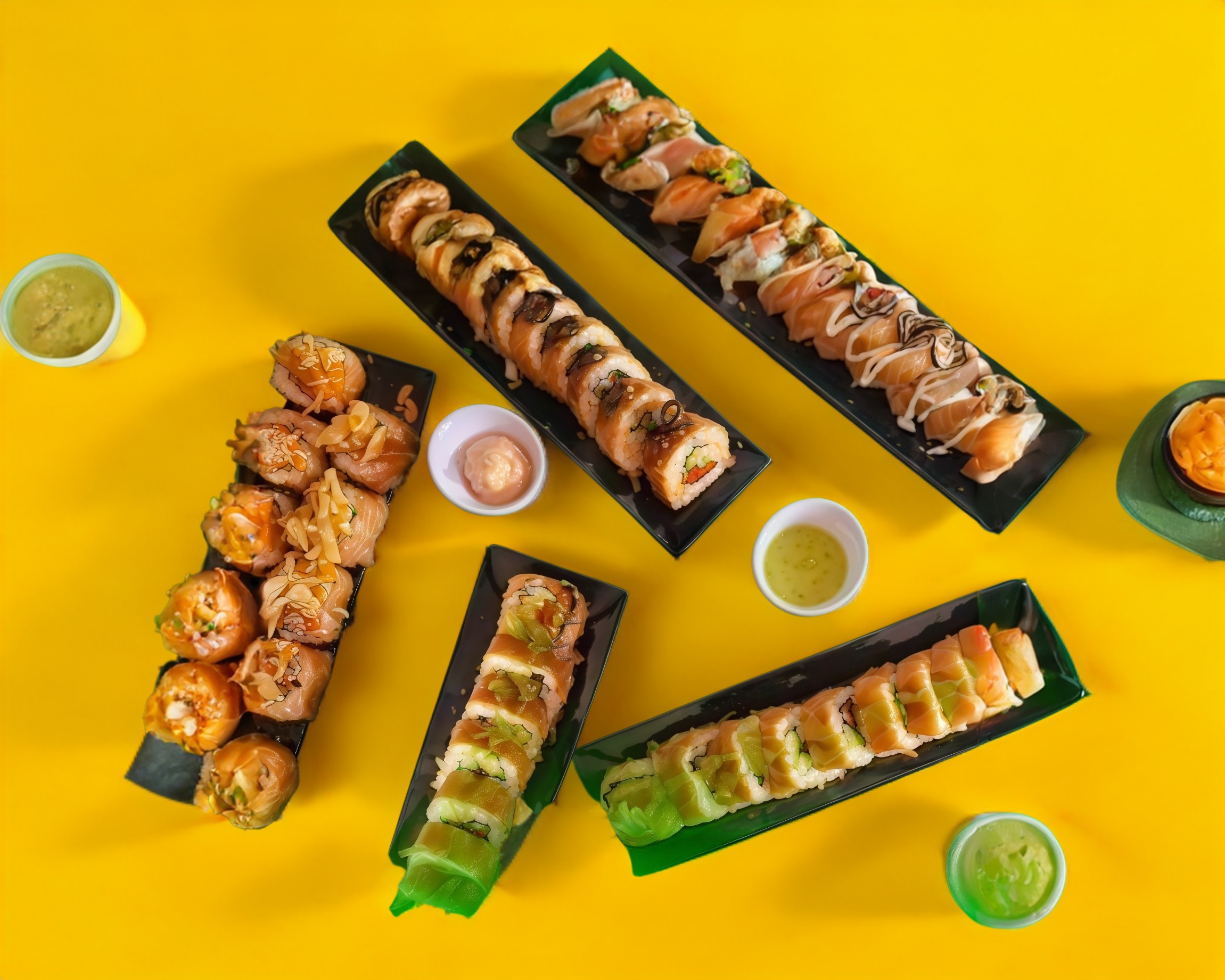 10 bocados-Pollo, aguacate, queso crema Philadelphia. Por fuera: salsa guacamole y ajonjolí.