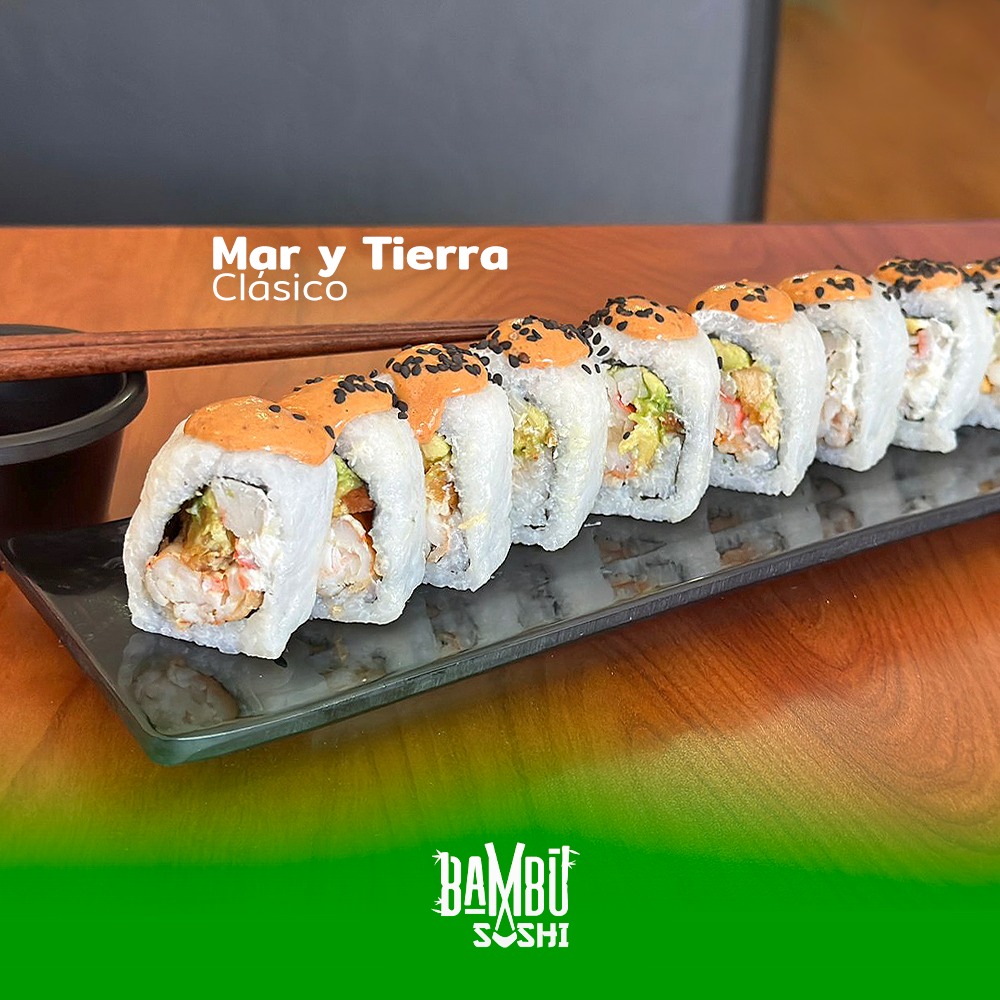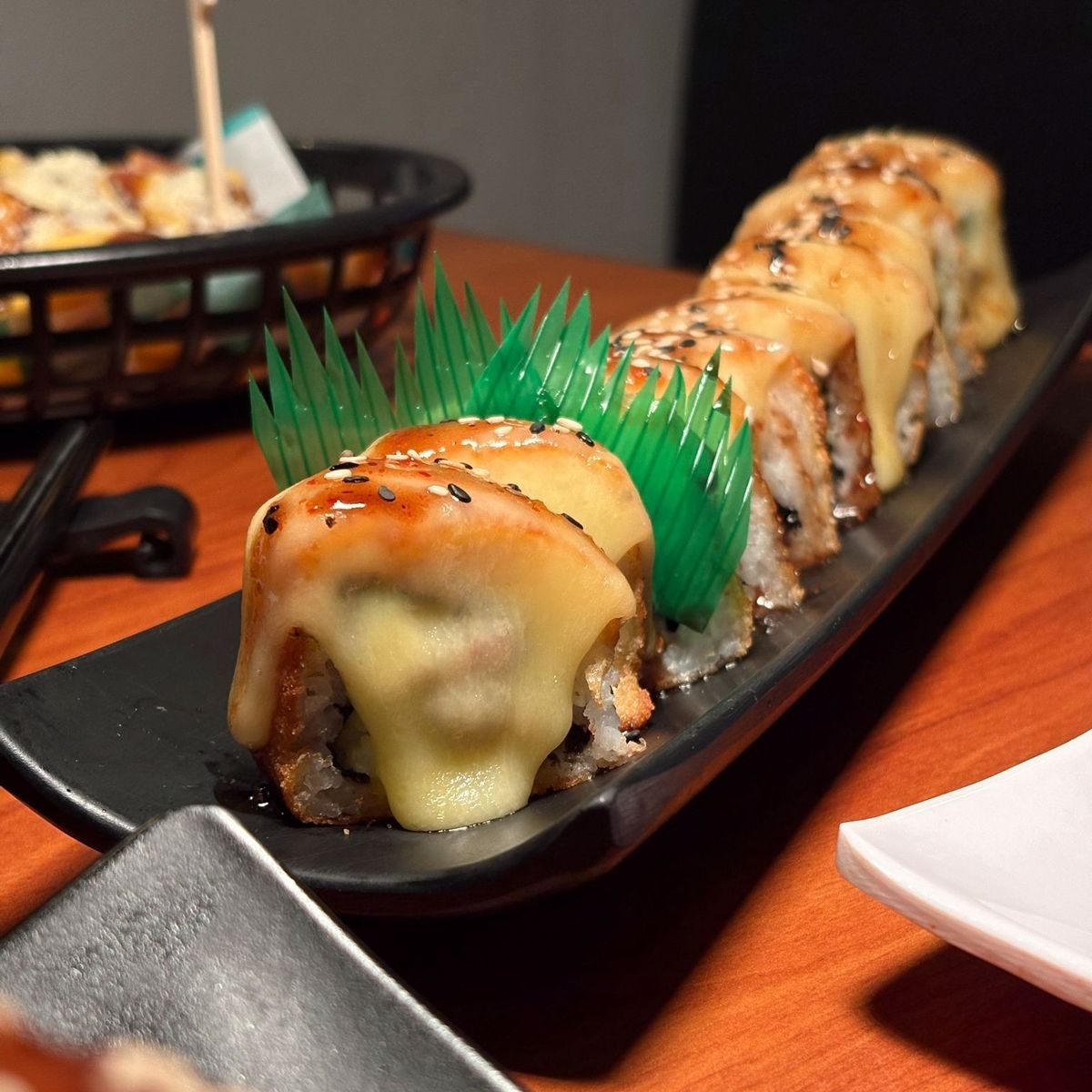 10 bocados-Camarón, aguacate, surimi, cubierto de queso manchego y por encima salsa chipotle y ajonjolí.