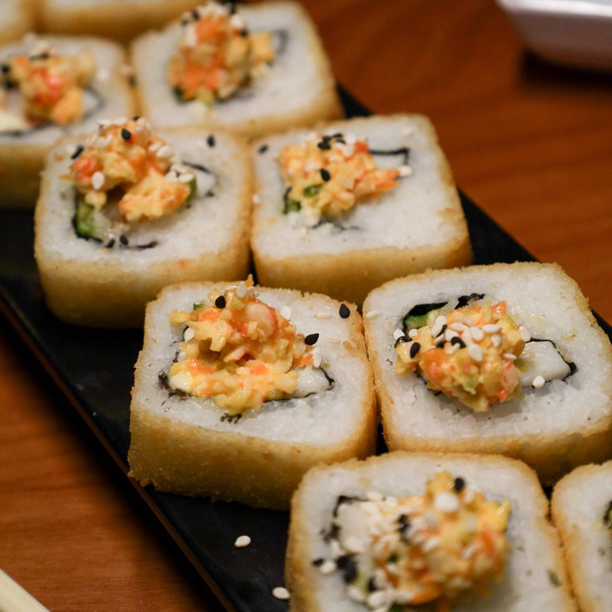 10 bocados-Surimi, aguacate y pepino. Por fuera: aderezo de piña y ajonjolí.