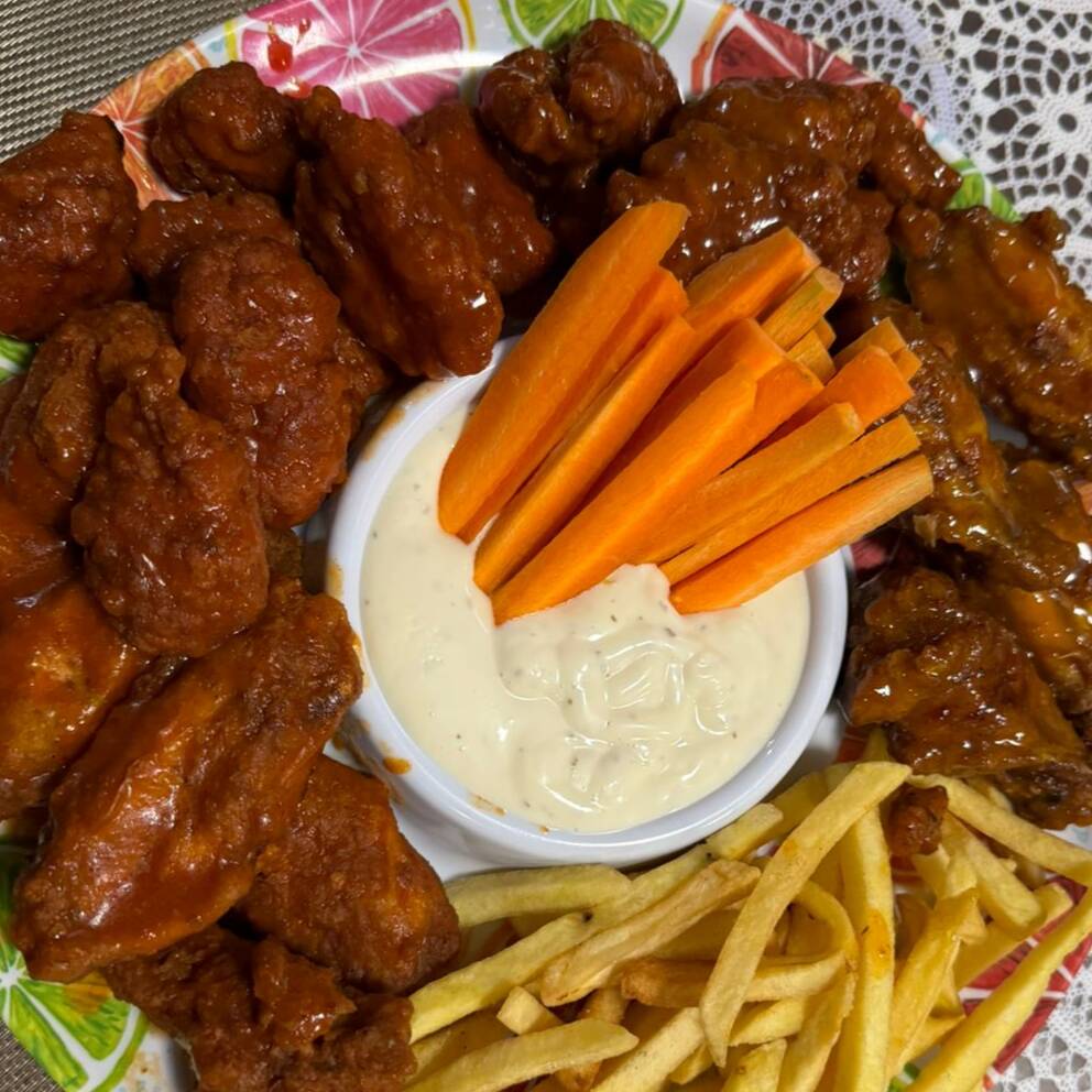24 ALITAS BAÑADAS EN SALSA A ELEGIR CON VEGETALES Y ADEREZO RANCH
