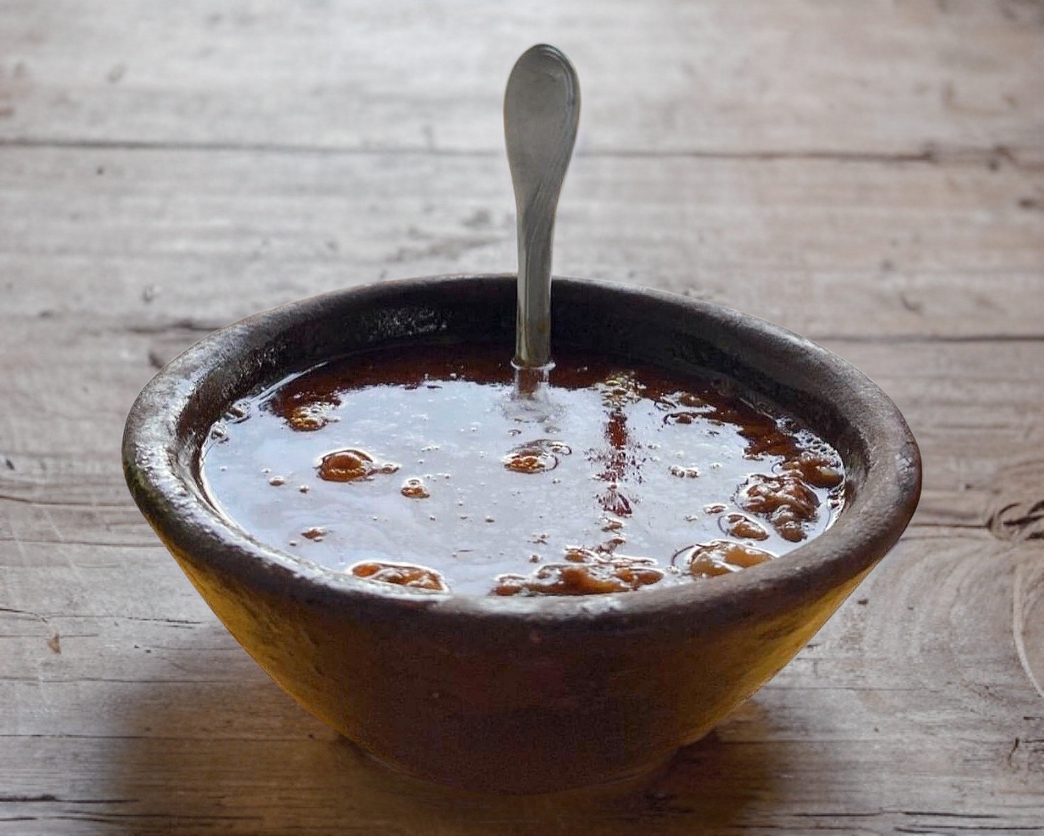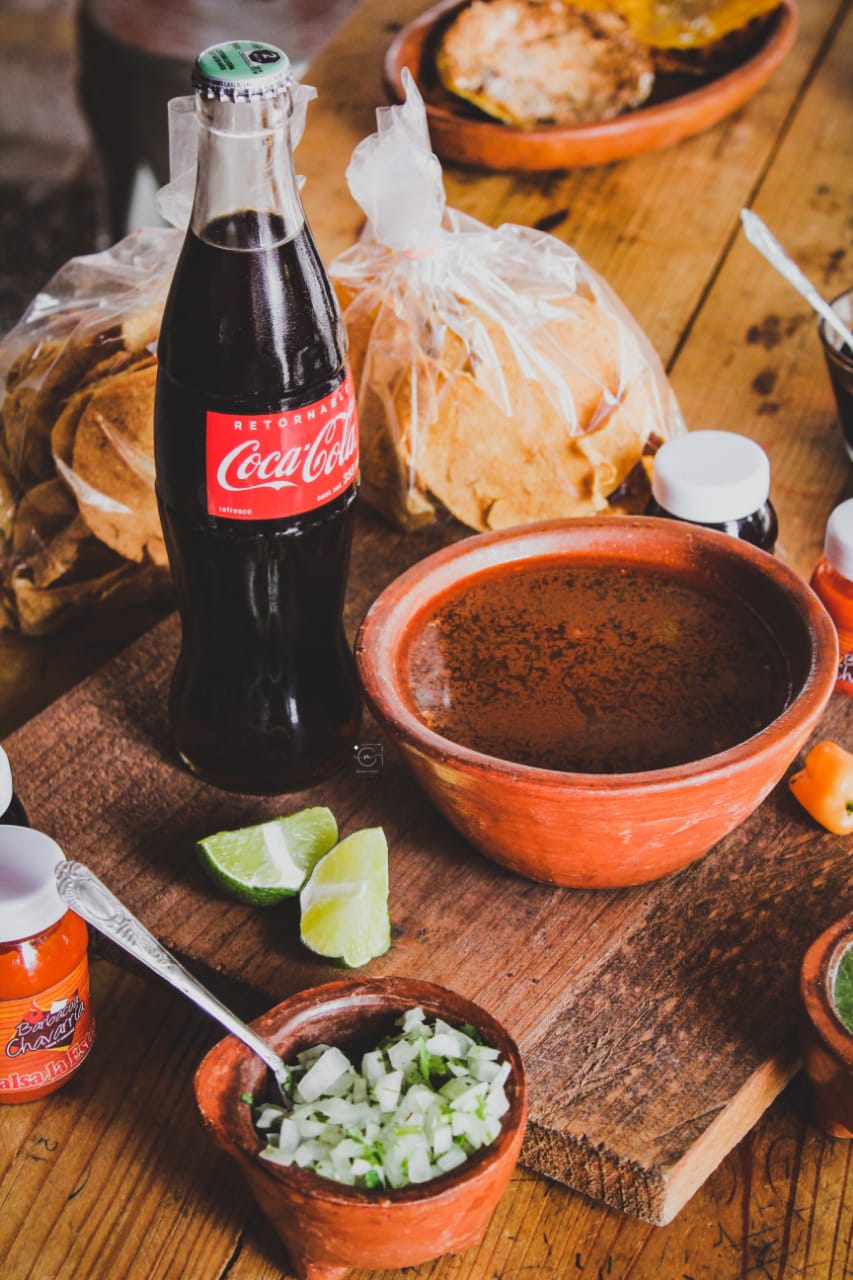 Tortilla, salsas, cebollita, limones y consomé chico sin carne