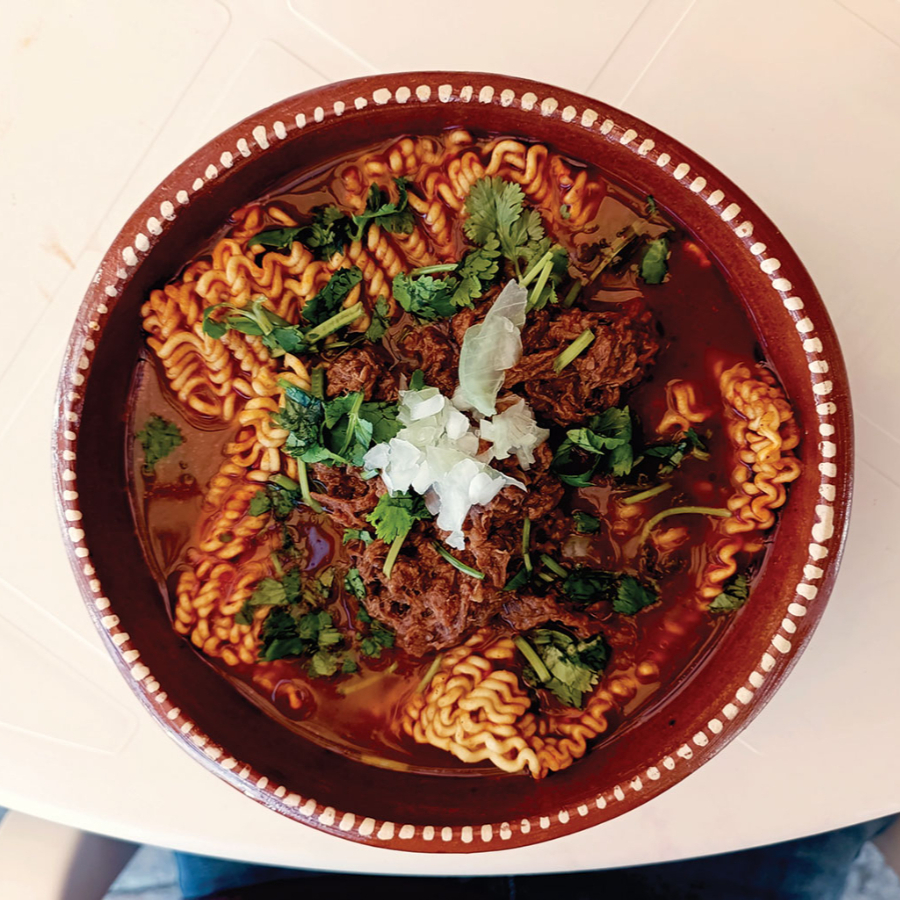 80gr. de carne de res más consomé de barbacoa tradicional, acompañado de su exquisita ramen, acompañado de cebolla con cilantro y tortillas calientitas.