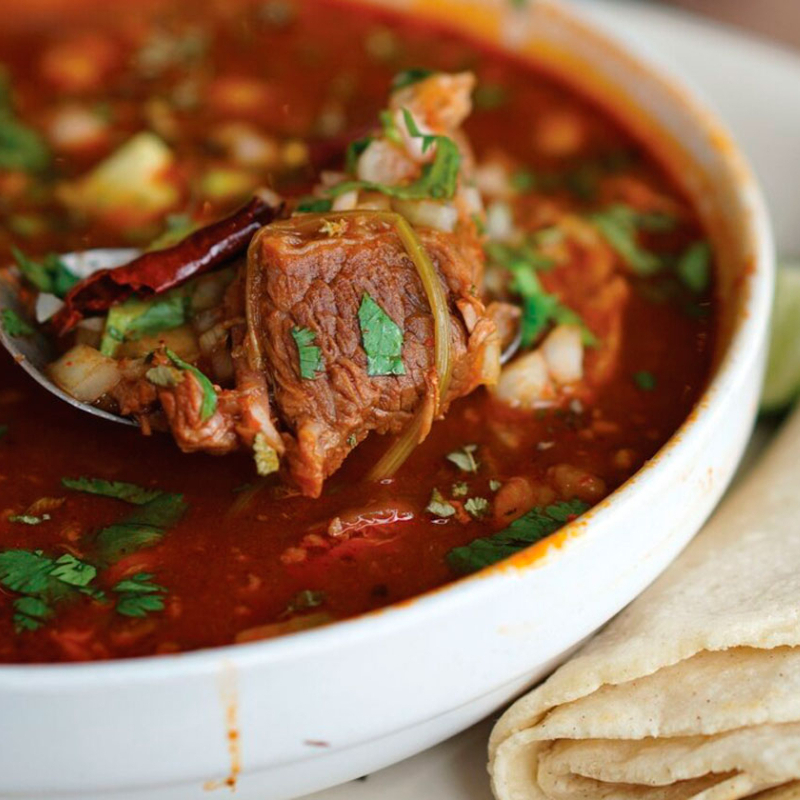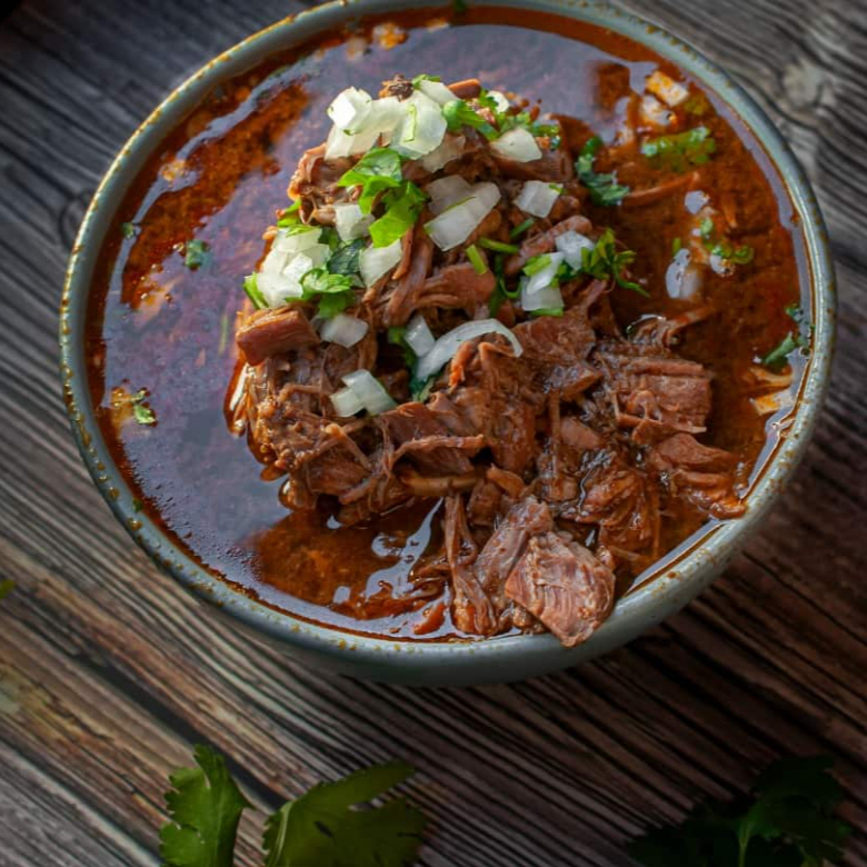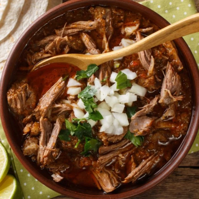 60gr. de carne de res más 500 ml. consomé de barbacoa tradicional, lleno de sabor, preparado con el jugo de la carne cocida lentamente al vapor, acompañado de cebolla con cilantro y tortillas calientitas.