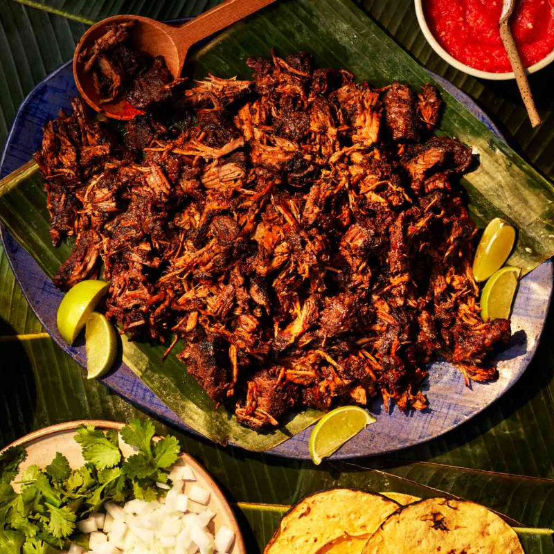 Tortilla de maíz rellena de jugosa barbacoa de res, acompañada con cebolla, cilantro fresco y salsa roja o verde al gusto.