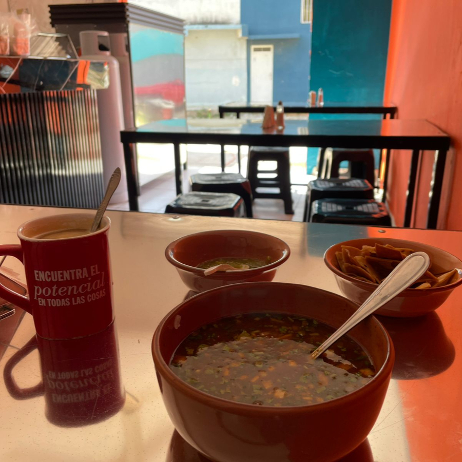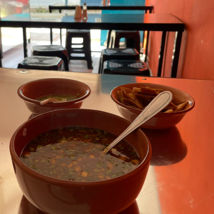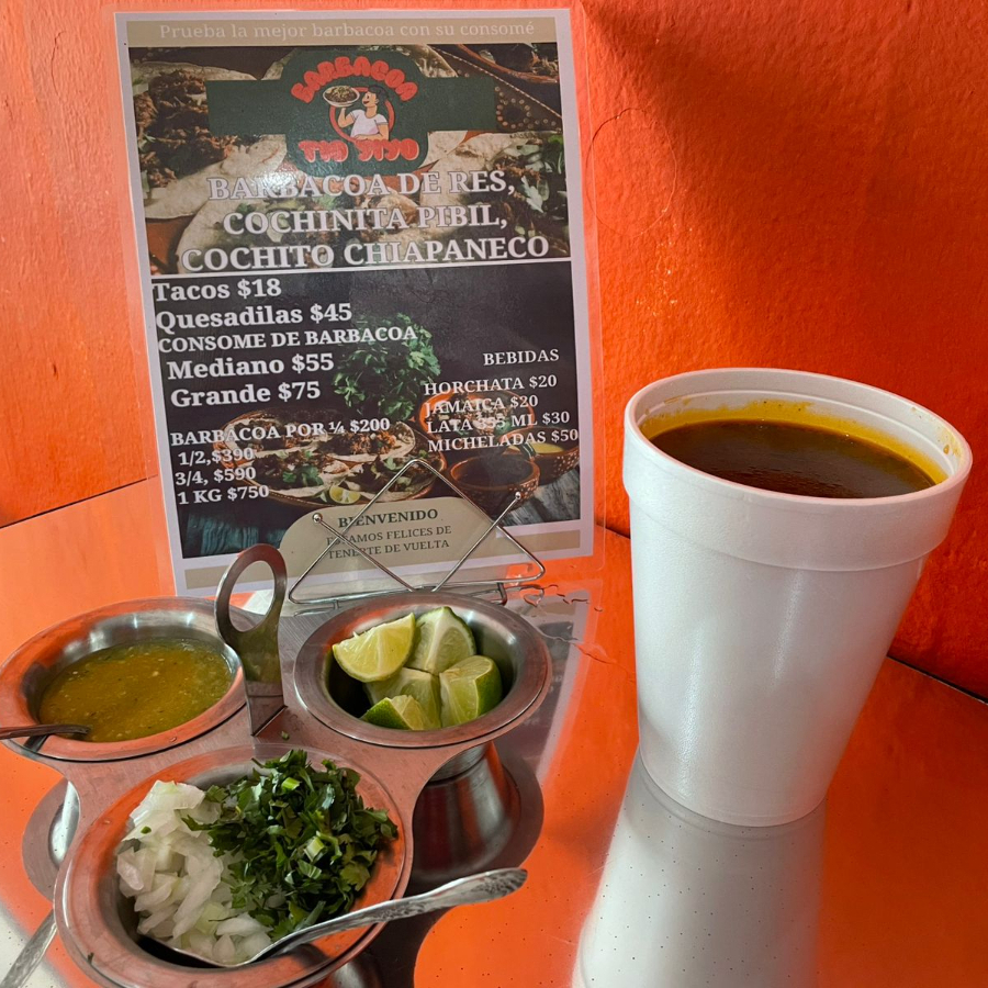 DELICIOSO CONSOME DE BARBACOA DE RES GRANDE. ACOMPAÑADO DE SUS TOSTADITAS, CEBOLLA Y CILANTRO ASI COMO SU RICA SALSA PICANTE
