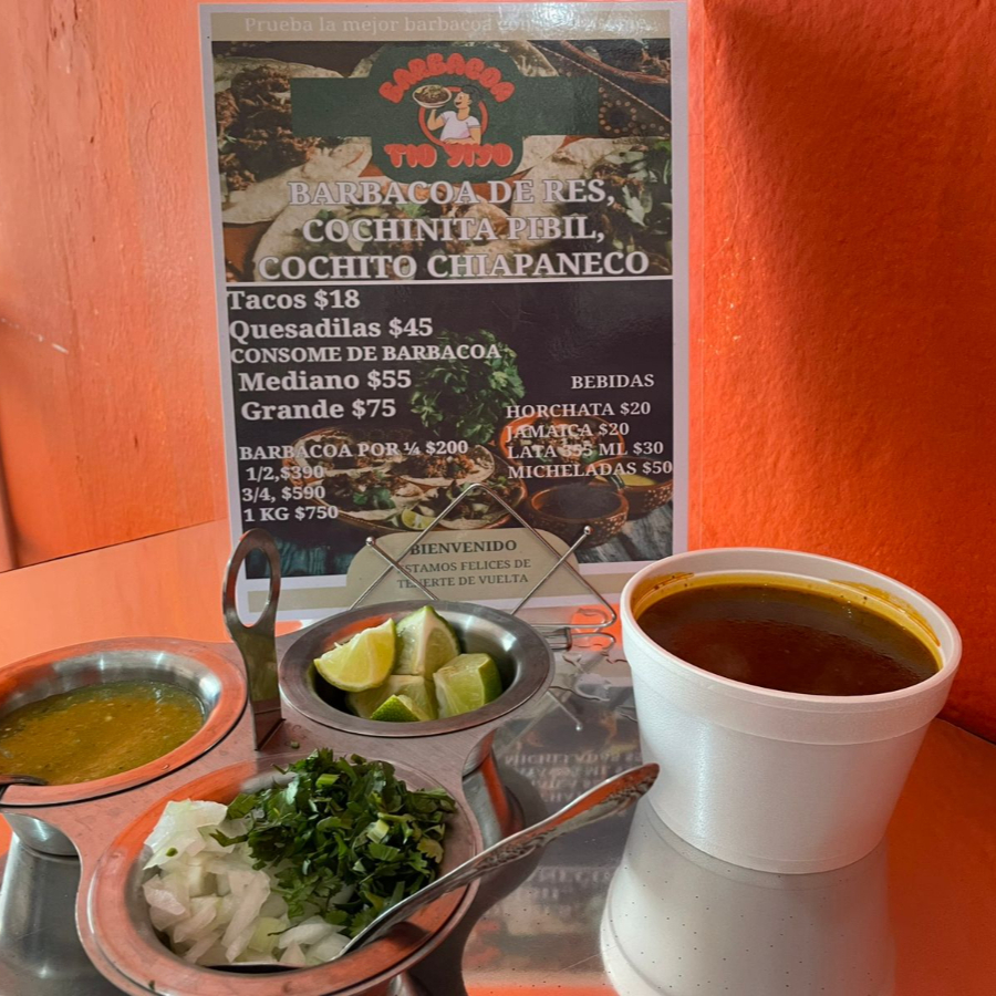 DELICIOSA BARBACOA DE RES EN CONSOME ACOMPAÑADO DE TOSTADITAS, CILANTRO Y CEBOLLA ASI COMO UNA RICA SALSA PICANTE.