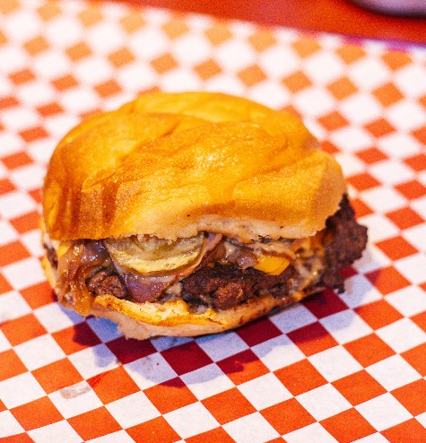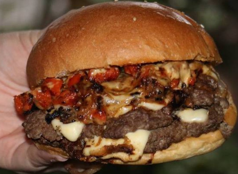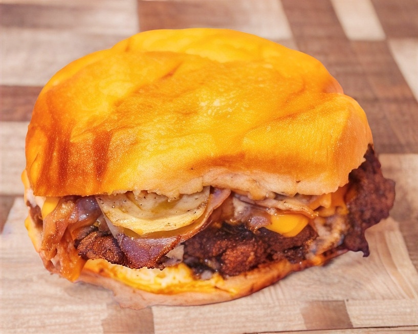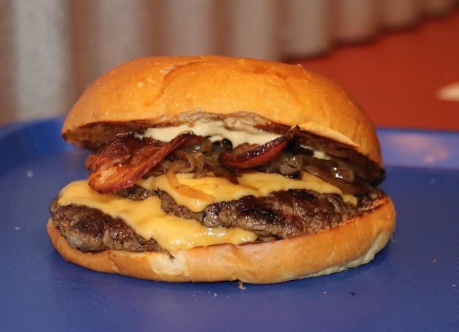 Pan brioche, doble carne, doble queso americano, tocino, cebollas, pepinillos y aderezo bigotón.