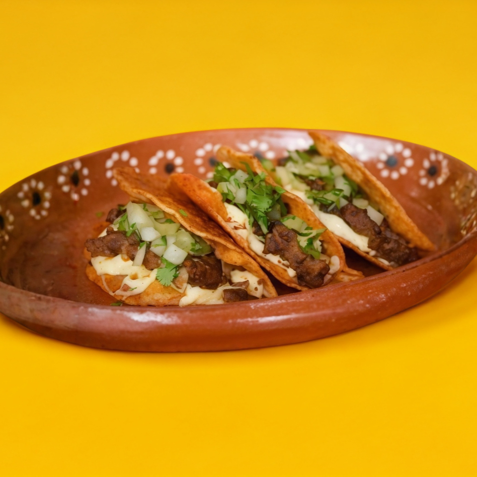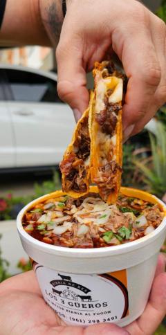 1 k De jugosa carne de birria, tortillas, salsa, cilantro y cebolla.