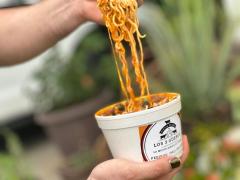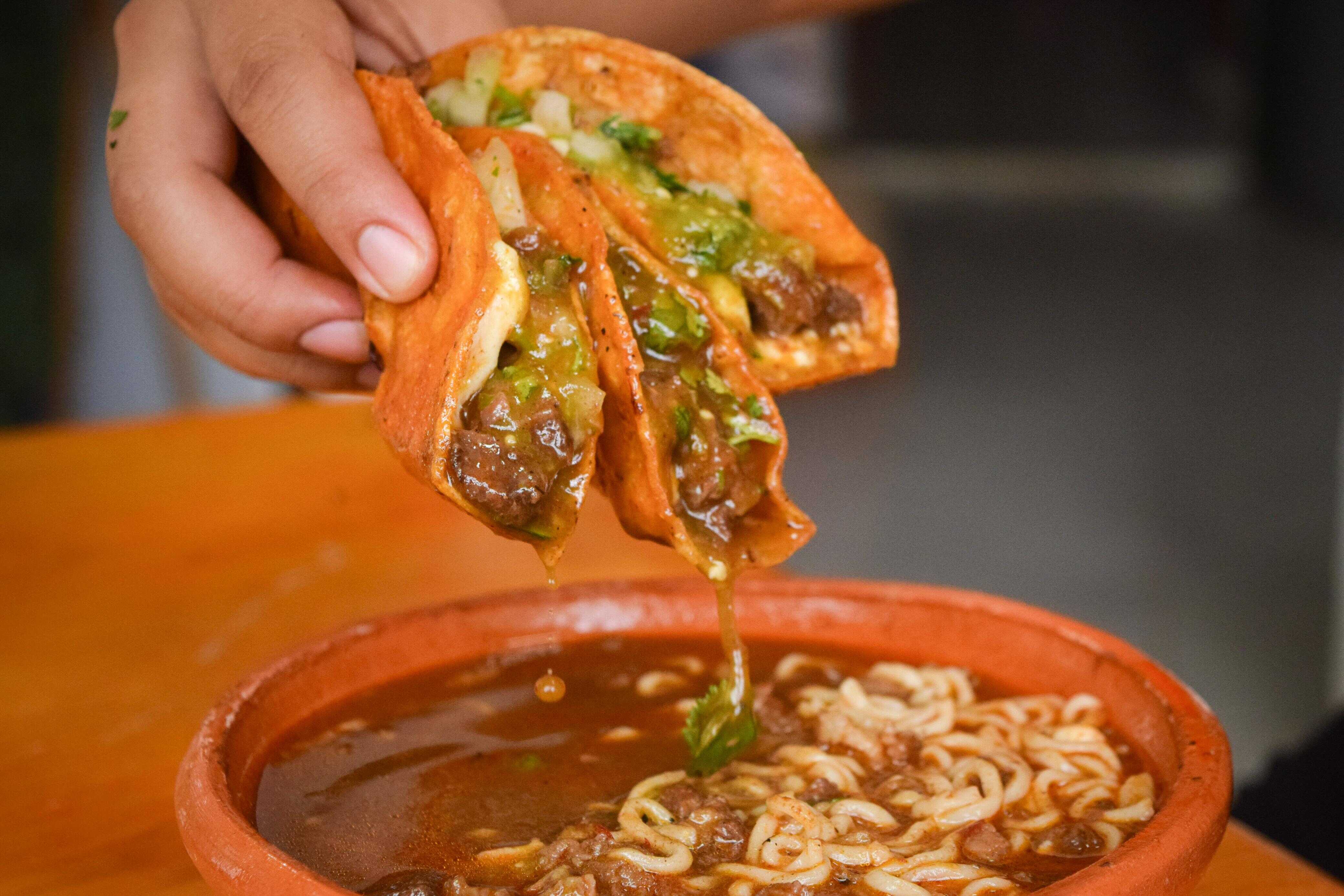 1/2 Litro de consomé, carne de birria y pasta ramen original, acompañado de cilantro, salsa y cebolla picada.