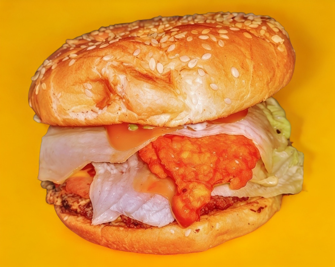 Hamburguesa clásica, Con Trocitos de boneless bañados en salsa de tu preferencia Acompañado de jamón, Tocino, queso amarillo tipo cheddar, Aguacate y todos sus vegetales.