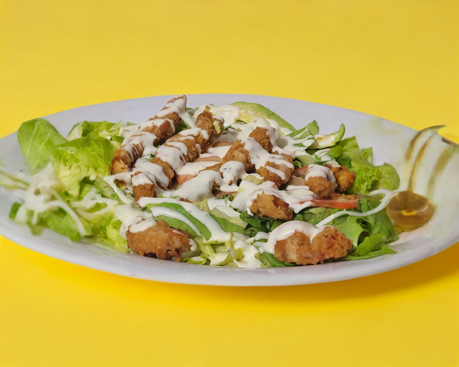 Ensalada tenders o fajitas; Esquisitas tiras de pollo empanizadas sobre una cama de lechuga fresca, una cama de tomate y aguacate. Incluye Aderezo ranch
