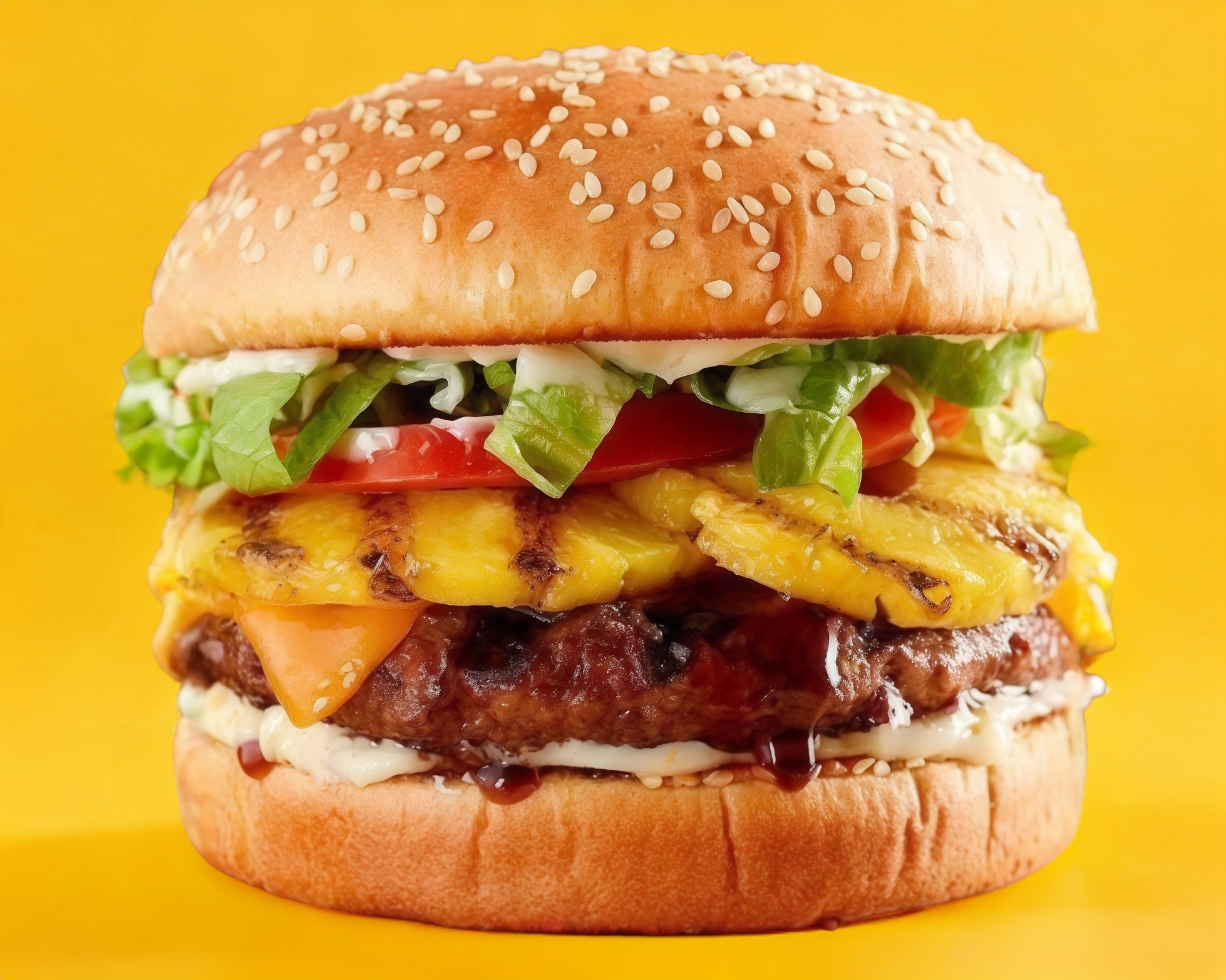Hamburguesa clásica de res con jamón, tocino, queso amarillo, Aguacate y todos sus vegetales, con una rebanada extra de piña.