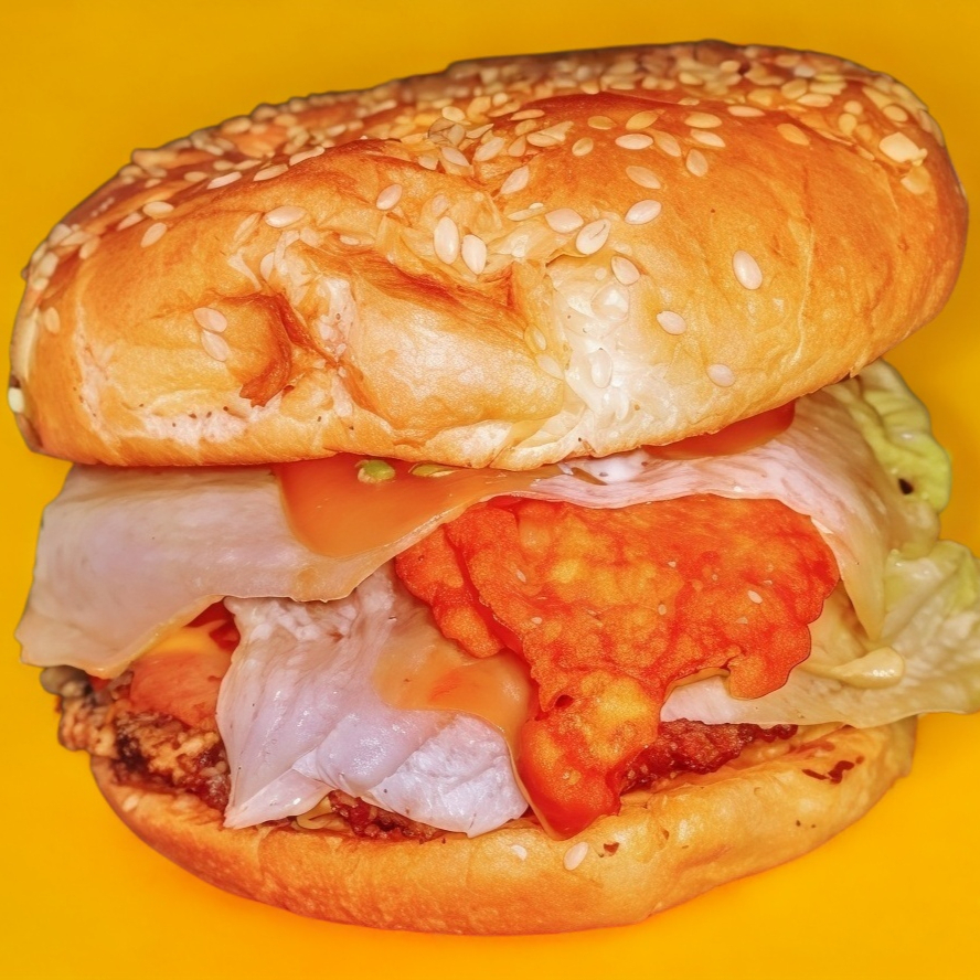Hamburguesa clásica, con trocitos de boneless bañados en salsa de tu preferencia, acompañado de jamón, salami, queso amarillo, aguacate y todos sus vegetales.