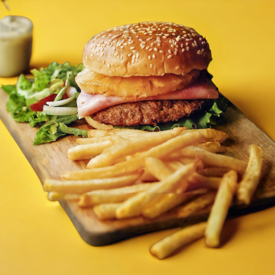 Hamburguesa clásica de res con jamón, tocino, queso amarillo, aguacate y todos sus vegetales, con una rebanada de piña.