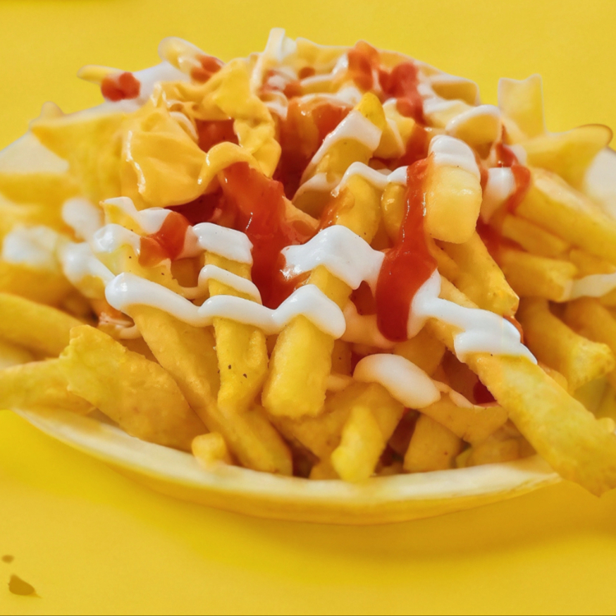 Orden de papas a la francesa bañadas con queso cheddar y acompañado con salsa cátsup.