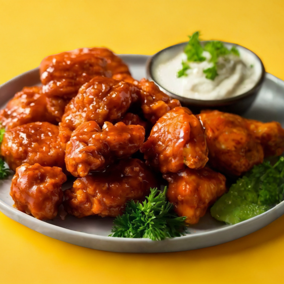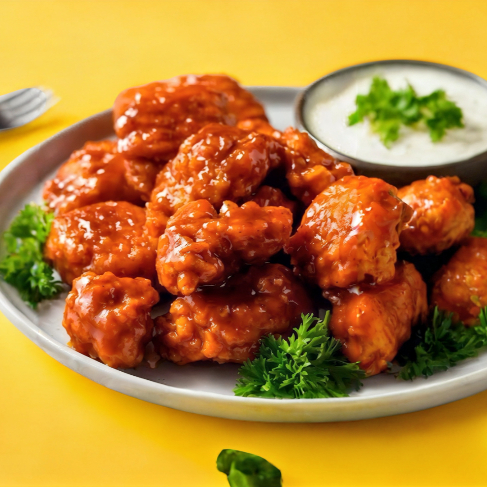Orden de boneless, trocitos de pechuga de pollo empanizados y bañados en exquisita salsa búfalo, acompañado de porción de papas a la francesa y un aderezo ranch 220 g.