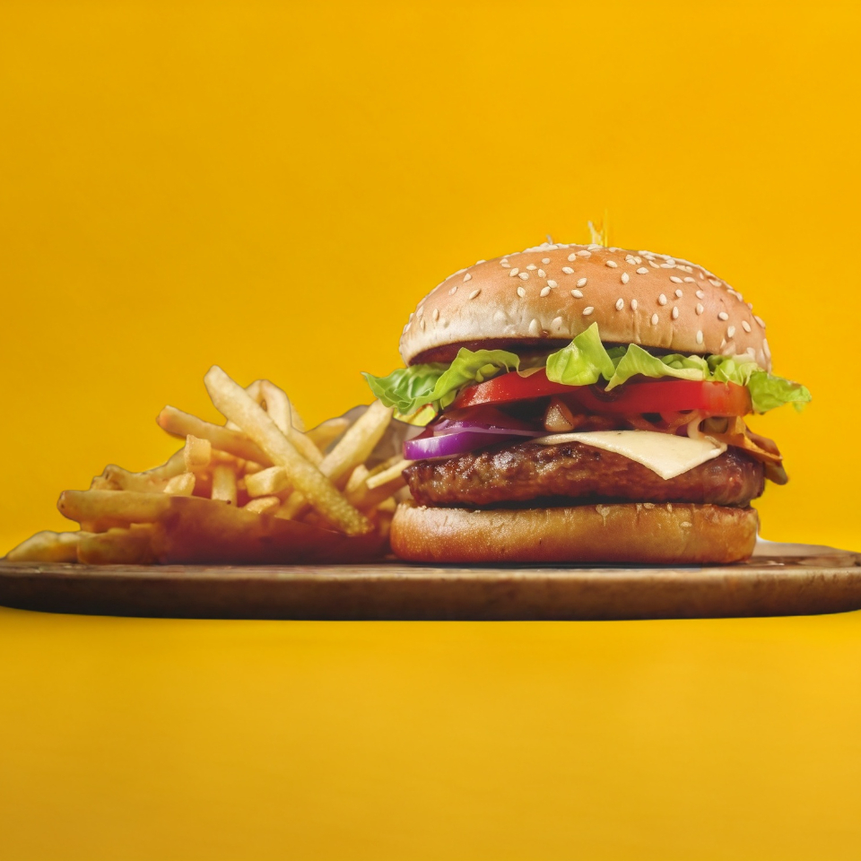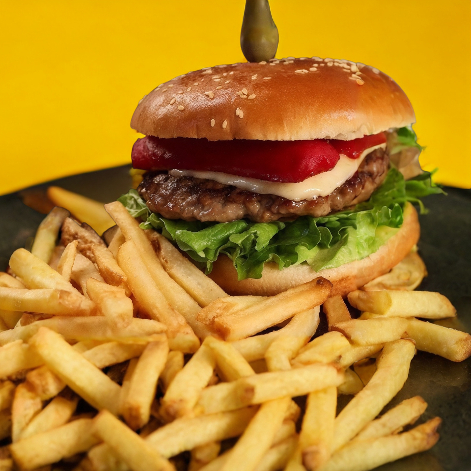 Hamburguesa clásica, con 110 g de carne de res, jamón, tocino, queso amarillo, aguacate y todos sus vegetales acompañado de una porción de papas.