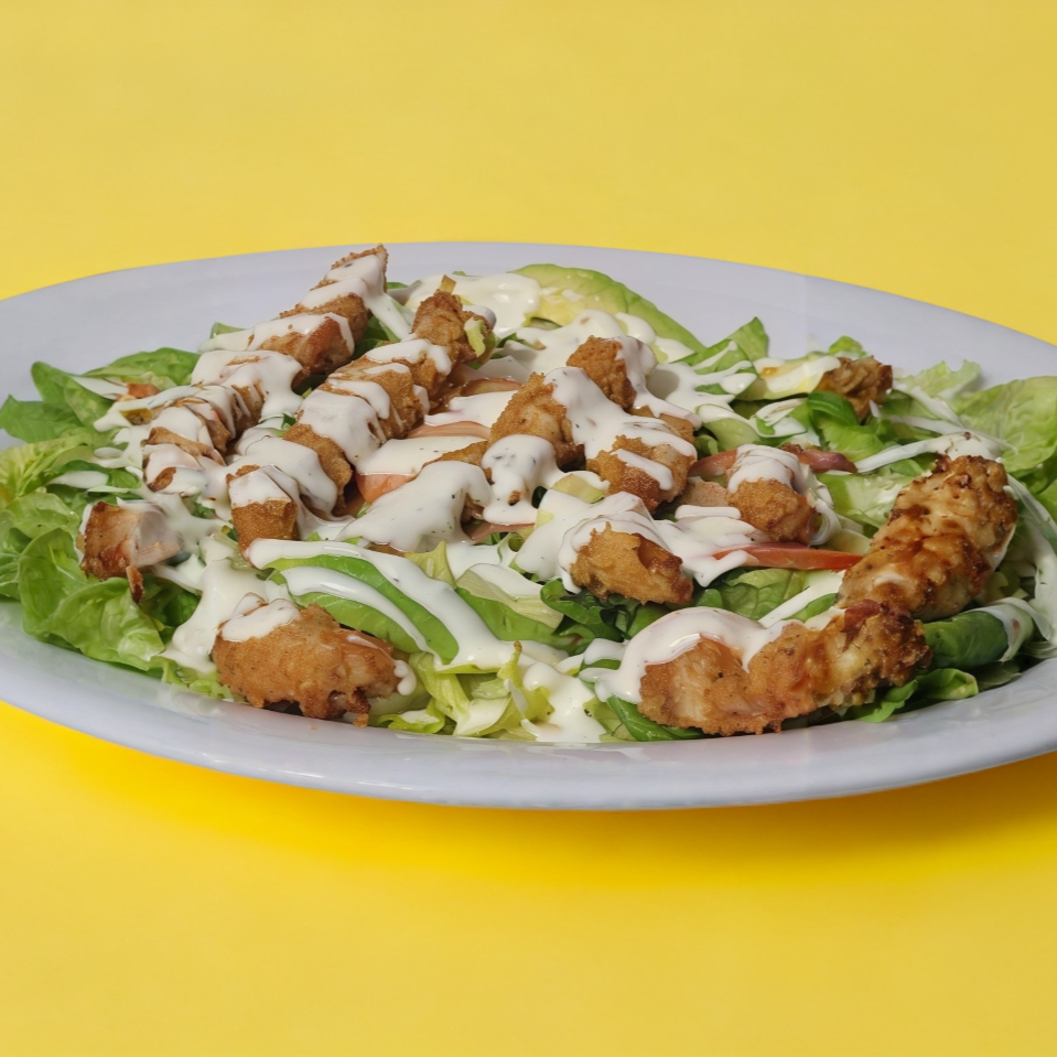 Ensalada tenders o fajitas; Esquisitas tiras de pollo empanizadas sobre una cama de lechuga fresca, una cama de tomate y aguacate. Incluye Aderezo ranch