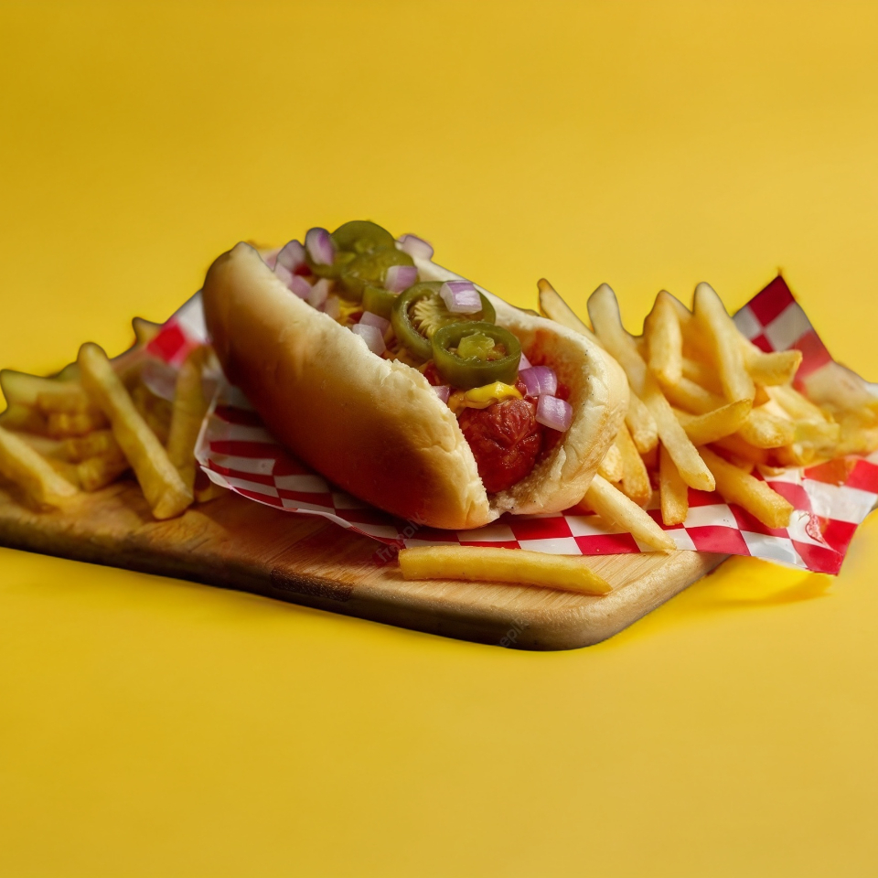 Hot dog clásico con salchicha, tomate, cebolla, y todos sus aderezos acampanado de una porción de papas a la francesa.