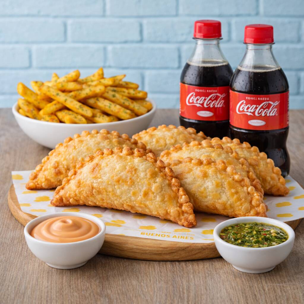 6 Empanadas + Papas Porteñas Medianas (125g) + 2 Refrescos 355ml (c/u) + 2 Aderezos Chicos (30ml c/u)