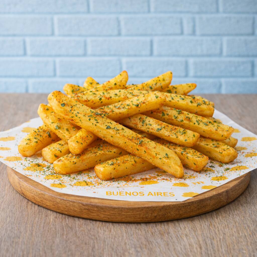 Bastones de papa, cubiertos con una mezcla especial de condimentos salados, ligéramente cítricos con un toque de queso. Un complemento crujiente inspirado en los sabores callejeros de Buenos Aires con un toque moderno.