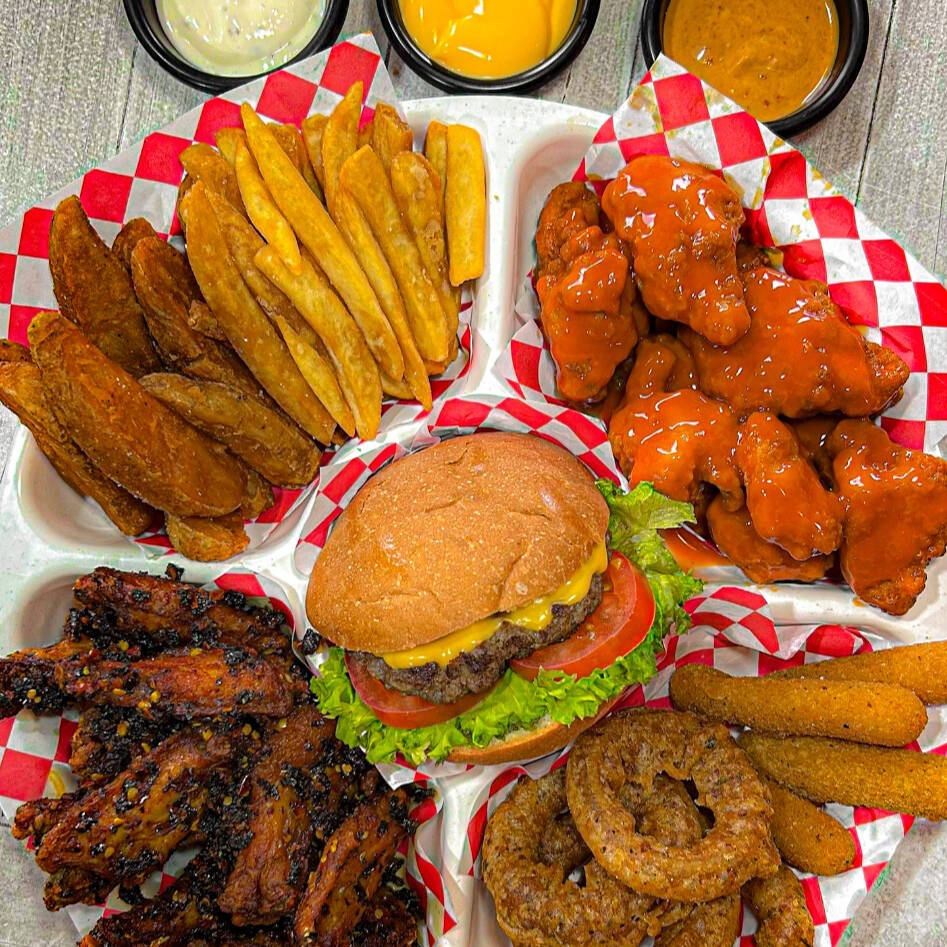 10 pzas De alitas, 10 pzs de boneless, 5 pzas de aros de cebolla, 100 g papas gajo, 1 pza mini cheese burger, 4 pzas de dedos de queso, 100 g papas a la francesa.