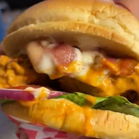 160 g De carne marinada, queso mozzarella, mermelada de tocino, cebolla morada, lechuga sangría, jitomate, mayonesa cheddar y aderezo sweet chipotle, acompañado de 50 g de papas a la francesa.