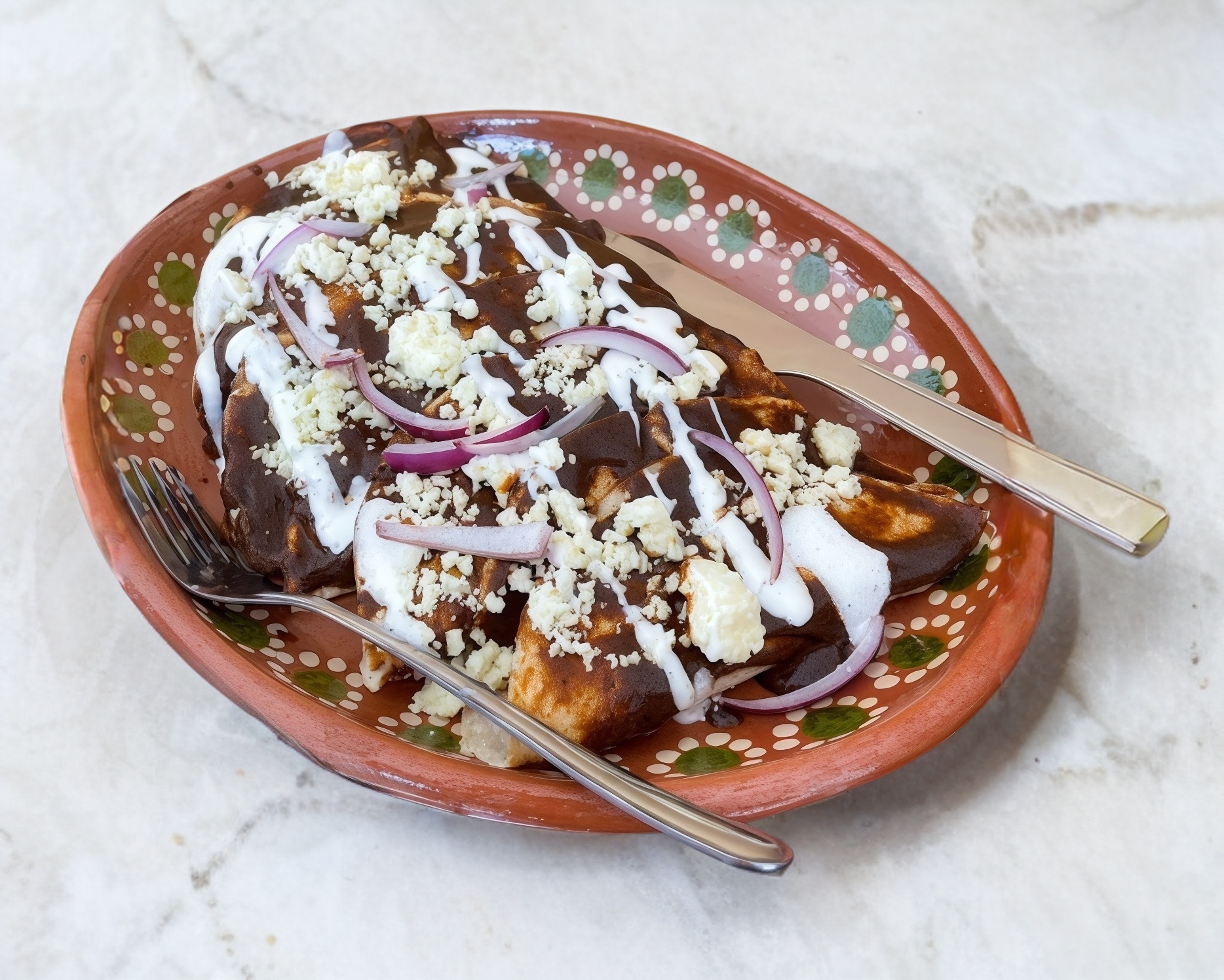 En Moladas, Mole poblano, con tortillas rellenas de pollo, cubierta con crema queso cebolla morada y aguacate
