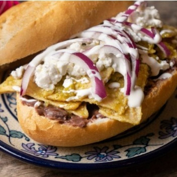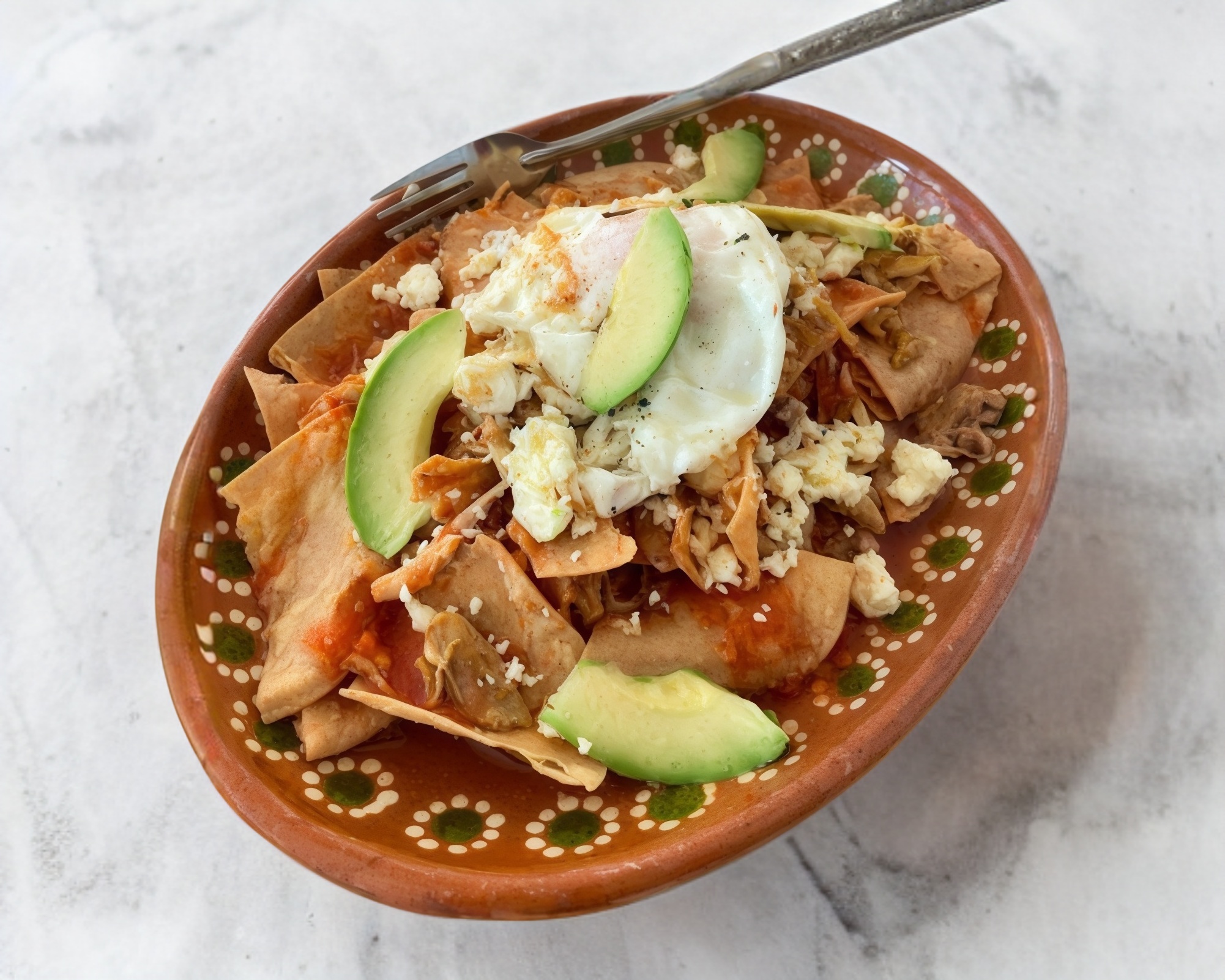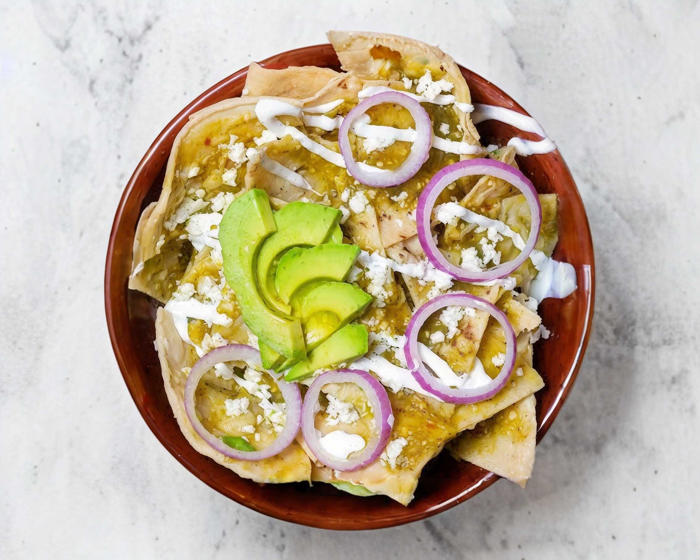 deliciosos chilaquiles en salsa Roja o Verde, con ricos frijoles refritos, crema queso, aguacates y cebollas.