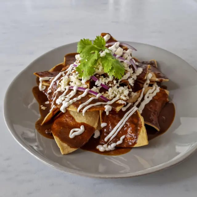 Ricos chilaquiles con pollo o arrachera de res, acompañado con aguacates, cebolla al gusto, queso y crema, bañado de un delicioso Mole Poblano