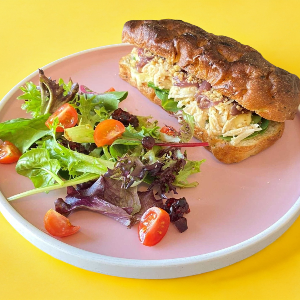 Focaccia a las finas hierbas con pollo a la plancha sobre una cama de espinacas, con cebolla caramelizada, queso panela, aderezo de manzana con chipotle y nueces. Acompañado de ensalda