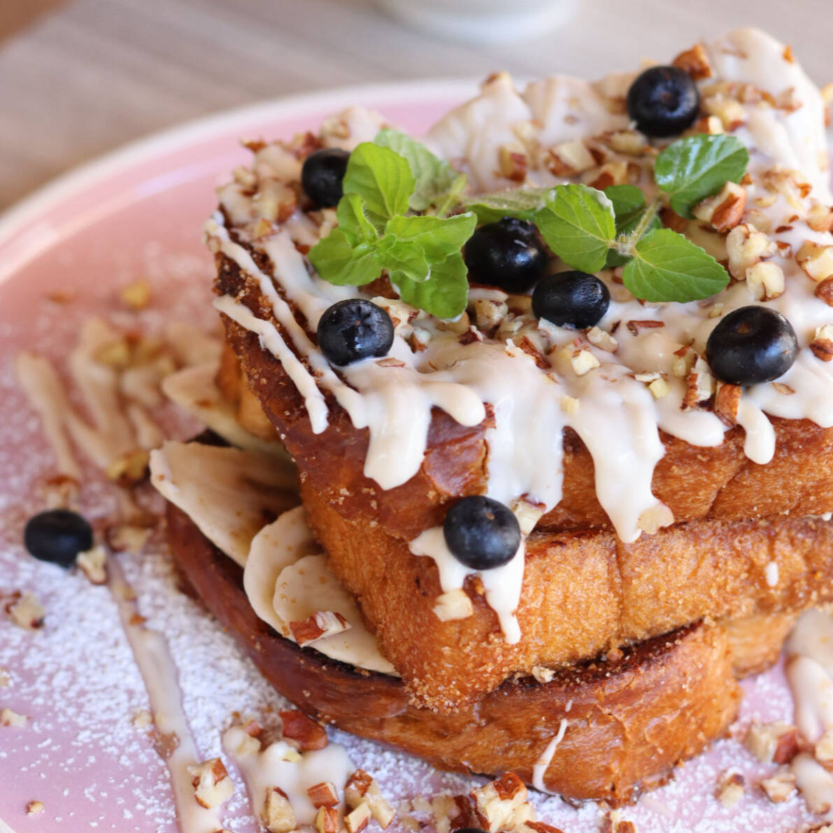3 piezas de pan de caja artesanal, nuestra mezcla de vainilla, espolvoreado con azucar y canela, decorado con platano, moras,nuez y glaseado de queso crema