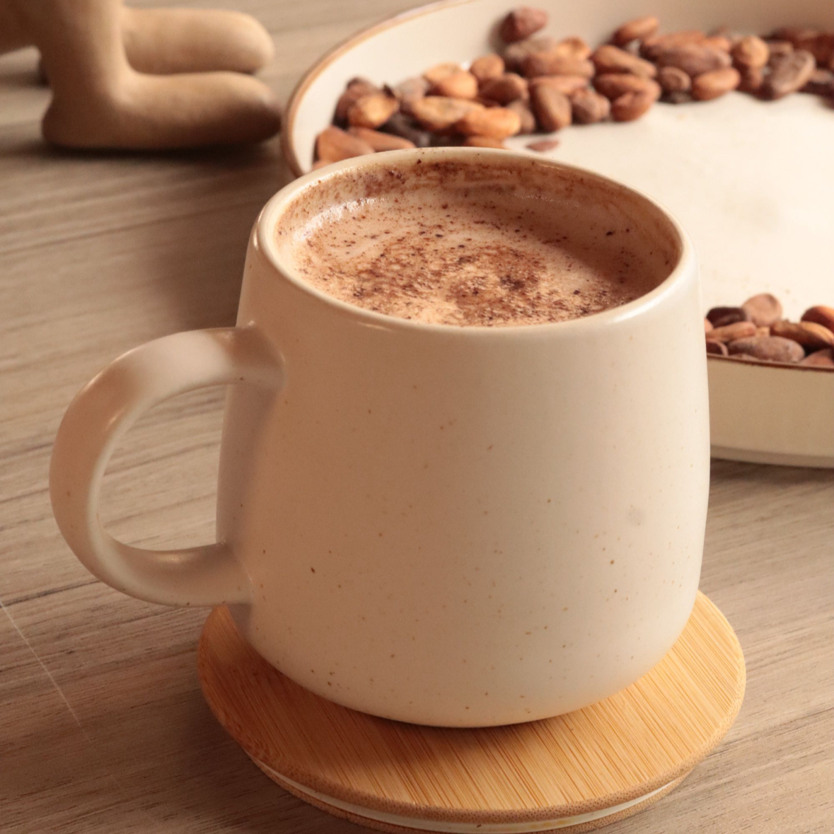 café orgánico 100% arábica cultivado en los altos de Chiapas. Cacao artesanal Zoque con menta natural.Leche base: Deslactosada