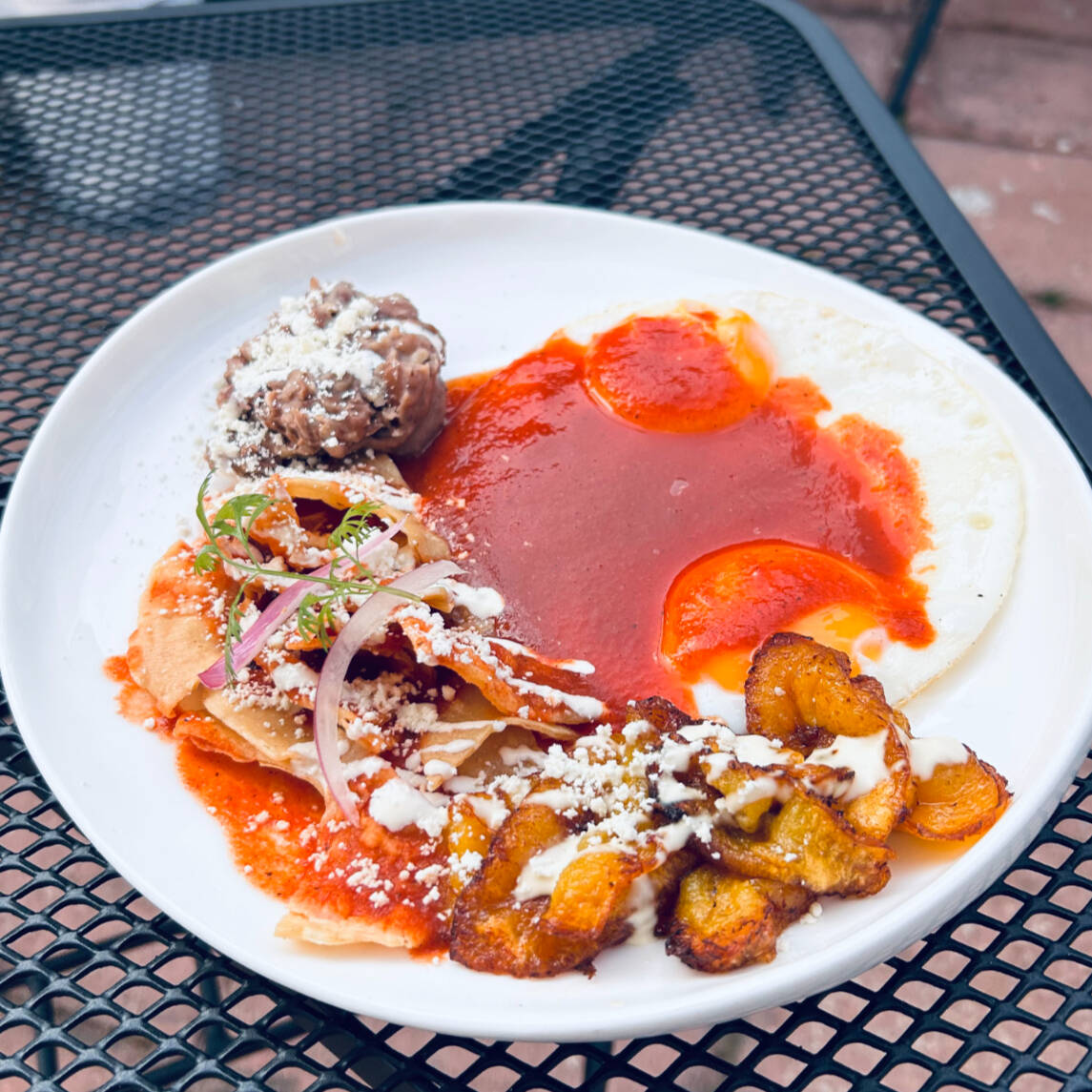 2 Huevos estrellados en salsa roja, acompañados de platanitos fritos, una porción de chilaquiles rojos y frijolitos bayos