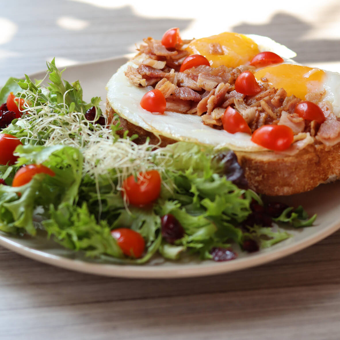 2 Huevos estrellados con tocino frito, montados sobre una rebanada de hogaza con guacamole , acompañada de ensalada