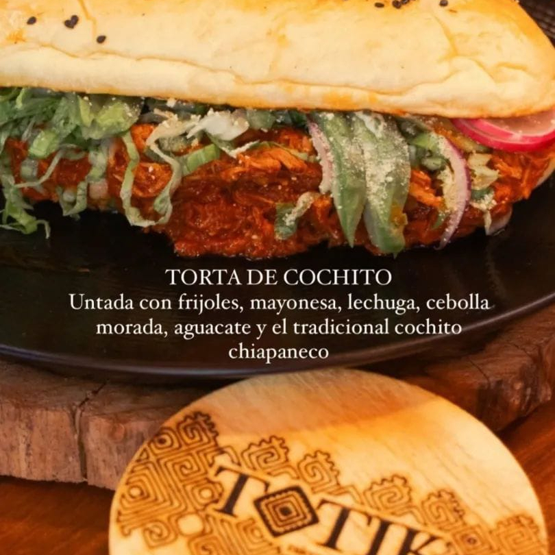Con frijoles, mayonesa, lechuga, cebolla morada, aguacate y cochito chiapaneco.