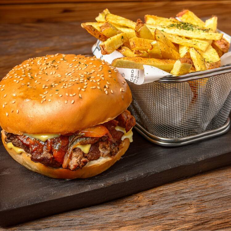 Carne molida, queso amarillo, cebolla caramelizada, lechuga y papas francesas.