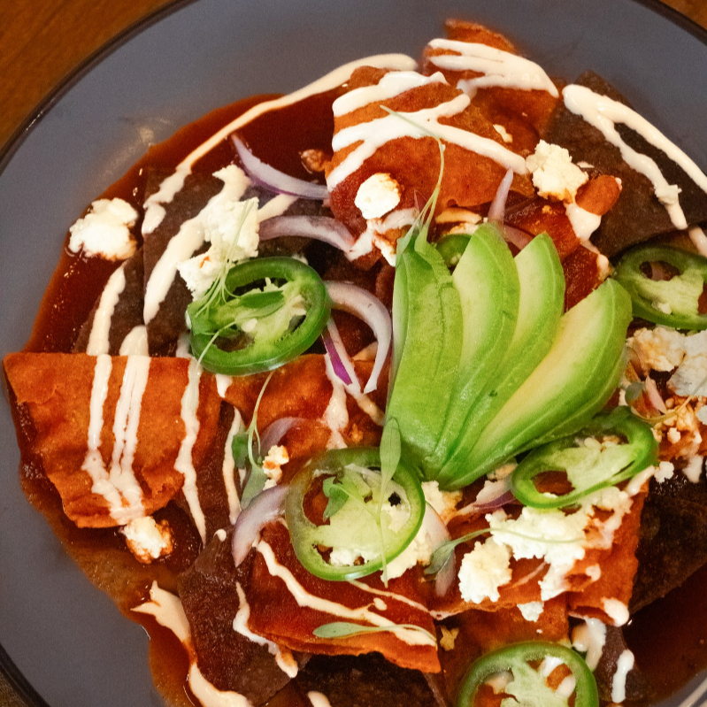 Tortilla crujiente en salsa verde o roja, crema, queso Chiapas, cebolla morada, aguacate y cilantro.