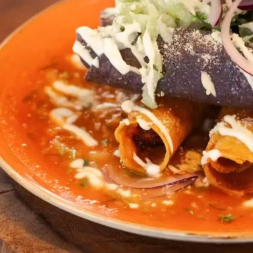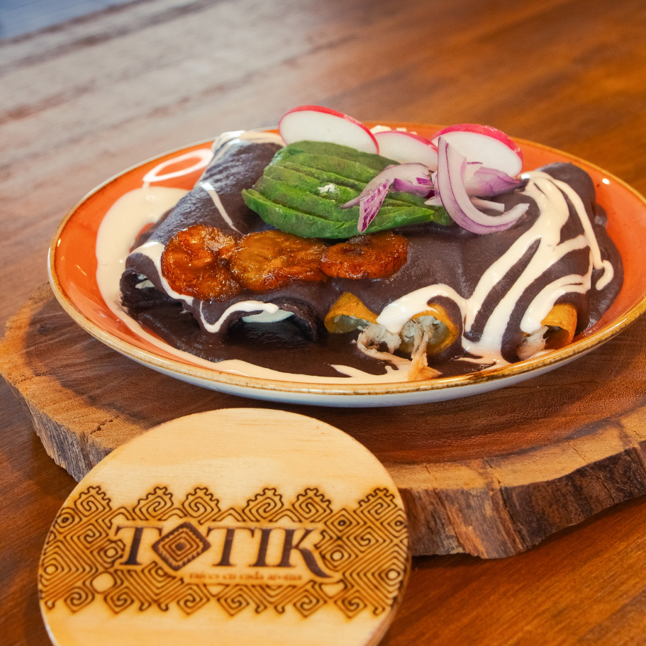 Tortillas (4) rellenas de pollo con mole de la casa, crema, queso, cebolla morada, aguacate y plátano.